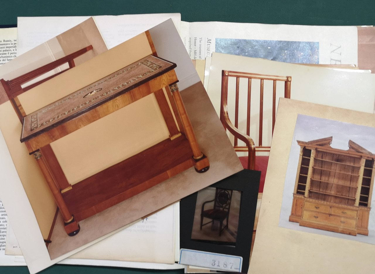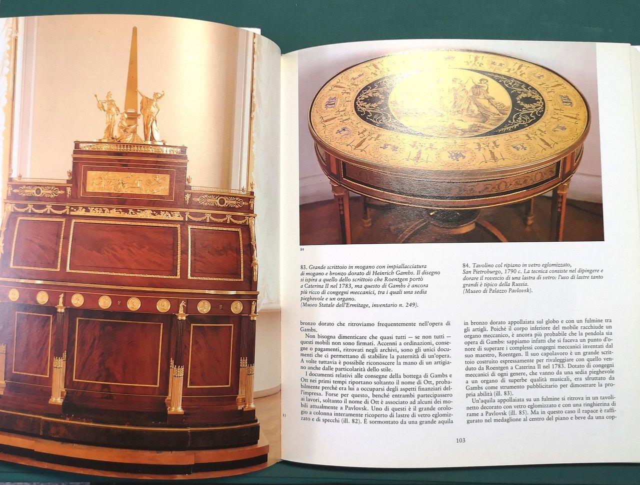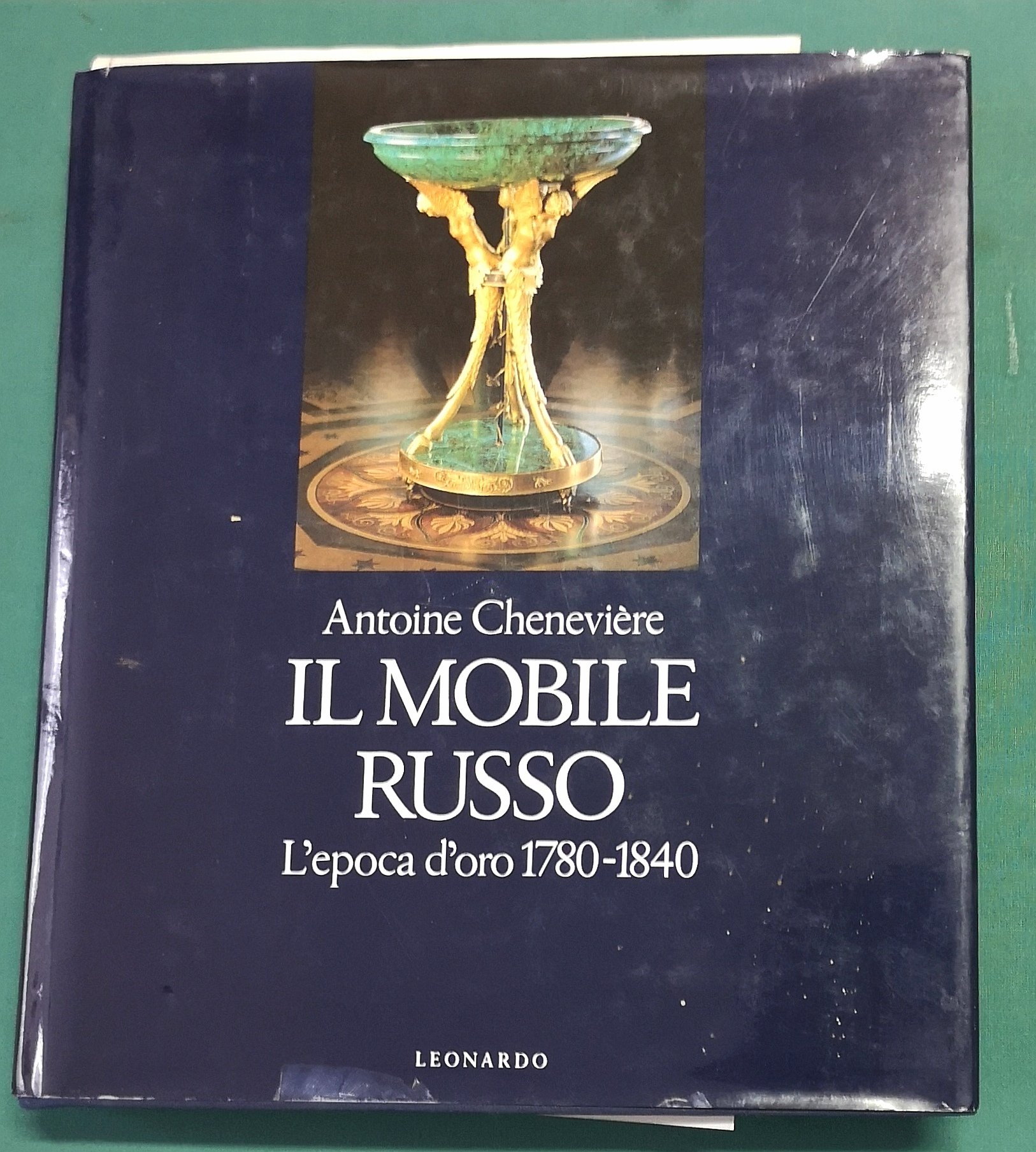 >in-4, pp. 309, con 308 illustrazioni in nero e a colori, anche a p.pagina. Leg. edit. tela blu, sovracoperta figurata a colori. Prima edizione di questo vasto repertorio di antiquariato artistico. Perfetto esemplare, Corredato da articoli di giornale e foto coeve di mobili russi.