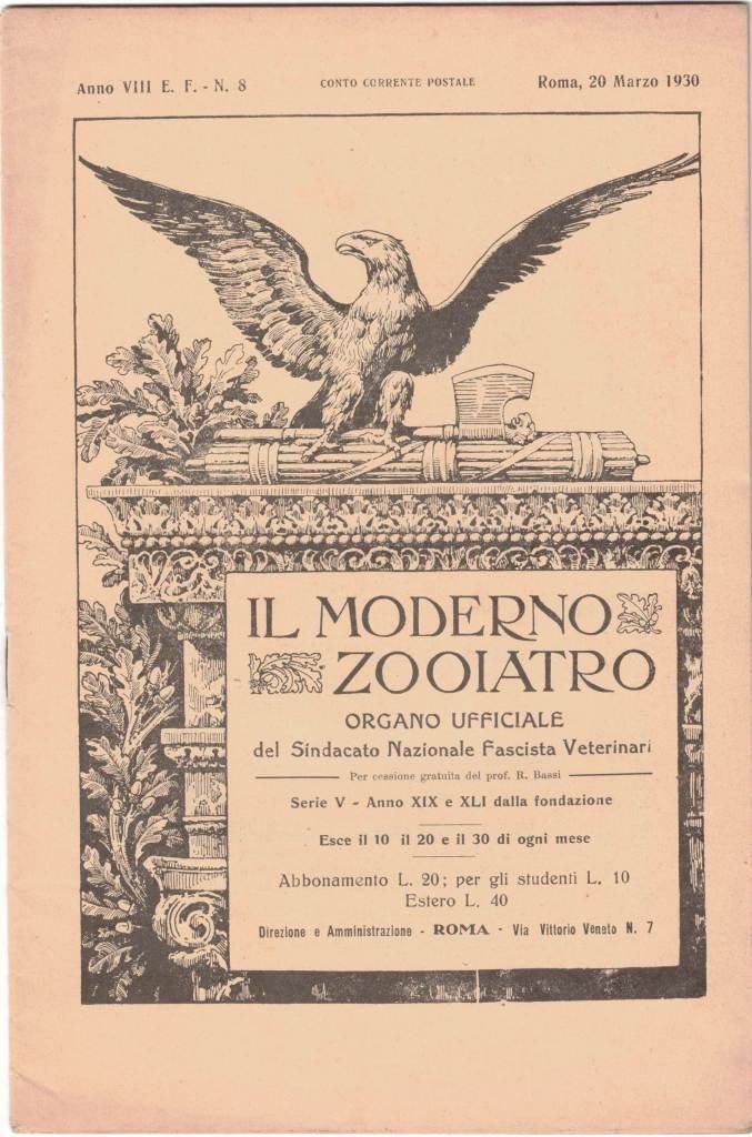 Il moderno zooiatro. Giornale trimensile del Sindacato Nazionale Veterinario, direttore Ettore Torti (poi Ezio Bonauguri), Roma, serie V, anni XIX-XX (XLI-XLII dalla fondazione), 1930-1931, 8 numeri non consecutivi, pp. 32 circa cad. per un totale di pp. 280, cm 24, fascicoli rilegati a punto metallico. Il lotto comprende i seguenti otto fascicoli della rivista Il moderno zooiatro. Giornale trimensile del Sindacato Nazionale Veterinario: serie V, a. XIX, n. 8, 20 marzo 1930, pp. 193-224 – serie V, a. XIX, n. 9, 30 marzo 1930, pp. 225-256 – serie V, a. XX, n. 1-2, 10-20 gennaio 1931, pp. 56, ill. b.n., 1 c. di tav. f.t. ill. b.n. – serie V, a. XX, n. 3, 30 gennaio 1931, pp. 57-88 – serie V, a. XX, n. 5, 20 febbraio 1931, pp. 121-152 – serie V, a. XX, n. 9, 30 marzo 1931, pp. 253-284 – serie V, a. XX, n. 13, 10 maggio 1931, pp. 381-412 – serie V, a. XX, n. 32, 20 novembre 1931, pp. 985-1016. Alla prima di copertina di ciascun fascicolo: Organo Ufficiale del Sindacato Nazionale fascista Veterinari (per cessione gratuita del prof. R. Bassi). Collaboratori: Domenico Bochicchio, Ciro Chiasserini, Pietro Sansonetti. Indici. A. XIX, n. 8, 1930: Comunicazioni ufficiali – V. Bossi, Alcune considerazioni sulla riforma degli Itituti Italiani di Medicina Veterinaria – P. Cavallo, Il latte – P. Ghezzi, L. Zerboni, La questione dei macelli – Sottoscrizione pro Borsa di Studio Bartolucci – Congresso Internazionale di Veterinaria di Londra – Atti degli Ordini e dei Sindacati – I nuovi Consigli degli Ordini dei Veterinari – Notizie – Leggi e decreti – Concorsi – Massime e sentenze – Necrologio (Giambattista Dalbono). A. XIX, n. 9, 1930: Comunicazioni ufficiali – Ottima iniziativa del Sindacato di Torino – P. Ghezzi, Ancora sulla questione dei macelli – Atti degli Ordini e dei Sindacati – La collaborazione in atto – Sottoscrizione pro Borsa di Studio Bartolucci – Notizie – Corso speciale sull’igiene del latte – Cassa mutua – Movimento professionale – Concorsi – Necrologi (Candido Aliberti) – Otturazione dell’esofago dei bovini causata dagli alimenti – Contributo alla casistica – Bibliografia. A. XX, n. 1-2, 1931: Comunicazioni ufficiali – I lavori del Congresso di Londra – Pietro Oreste – La Stazione Sperimentale Zooprofilattica della Sicilia – Una storia dell’ippicoltura italiana – Raccolta di legislazione sanitaria – Nel paese del latte – La lotta contro la sterilità bovina – Sottoscrizione pro Borsa di Studio Bartolucci – Movimento professionale – Atti degli Ordini e dei Sindacati – Concorsi – Notizie – Leggi e regolamenti – Massime e sentenze – Necrologio (Saverio De Sparano). A. XX, n. 3, 1931: Comunicazioni ufficiali – I lavori del Congresso di Londra – Raccolta di legislazione sanitaria – Costituzione della Società Piemontese-Ligure di Cultura Veterinaria – Contro la sterilità bovina – Condanne di empirici – Movimento professionale – Sottoscrizione pro Borsa di Studio Bartolucci – Atti degli Ordini e dei Sindacati – Concorsi – Notizie – Massime e sentenze – Necrologio (Alfonso Cavani) – Parte scientifico-pratica: L’anaesotubercolina mista nella diagnosi della tubercolosi bovina – Un caso tipo di acetonemia in una vacca – Recensioni. A. XX, n. 5, 1931: Comunicazioni ufficiali – I lavori del Congresso di Londra – Il consumo delle carni in Provincia di varese – Il mercato delle carni nel Brasile – Sottoscrizione pro Borsa di Studio Bartolucci – Movimento professionale – Atti degli ordini e dei Sindacati – Concorsi – Notizie – Giurisprudenza – Leggi e regolamenti – Bibliografia – Necrologio (Simone Arrighi). A. XX, n. 9, 1931: Comunicazioni ufficiali – Per la disciplina sindacale – Combattiamo l’empirismo – Movimento professionale – Concorsi – Notizie – Parte scientifico-pratica: Nuovo ed economico silos per foraggi – Un caso di lussazione ileo-sacrale in un cavallo – Bibliografia – Rassegna della stampa. A. XX, n. 13, 1931: Comunicazioni ufficiali – Il discorso di S. E. Bodrero alla Camera – In tema di concorsi sanitari – A proposito del riconoscimento ufficiale dei castrini – Una bella iniziativa del Sindacato di Ferrara in favore dei colleghi disoccupati – Un corso di perfezionamento per veterinari a Bologna – Per il miglioramento zootecnico a Pesaro – I primi dati sul censimento bestiame del 1930 – Una legge per combattere la morva in Bulgaria – Movimento professionale – Concorsi – Notizie – Giurisprudenza. A. XX, n. 32, 1931: Comunicazioni ufficiali – L’industria zootecnica – I minimi di stipendio per i sanitari comunali – La vaccinazione antitubercolare col metodo di Calmette e Guérin – I prezzi al dettaglio delle carni in rapporto ai prezzi dei bovini da macello – L’alimentazione del cavallo – Lotta contro la sterilità bovina – Mascalcia – Onorificenze (Guido Finzi, Ferdinando Pacchierotti) – Concorsi – Notizie – Giurisprudenza – Necrologio (Domenico Cinicchio) – Lutto colleghi. Firma d’appartenenza a margine della prima di copertina di due fascicoli. Un paio di fascoli con lievi tracce d’uso, per il resto ottimo insieme.