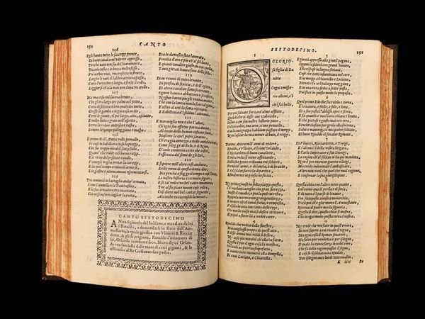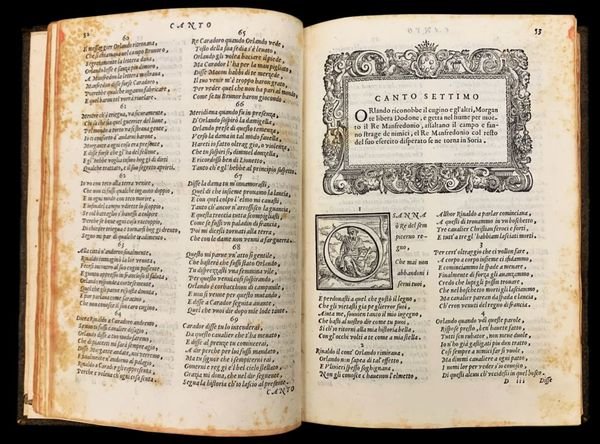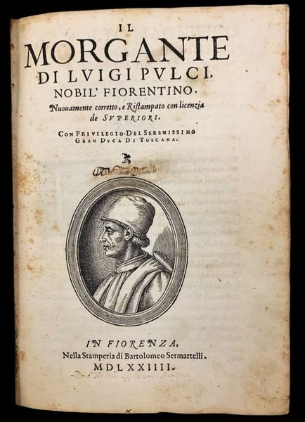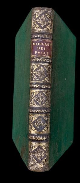 In 4° (22,5x15,5 cm); (16), 390, (2) pp. Legatura coeva in piena pelle maculata con titolo, autore e ricchi fregi ai tasselli. Piccola abrasione antica a cancellare antica e piccola nota di possesso privato al frontespizio solo in parte ancora leggibile Di Enea (?) . Ritratto del Pulci entro medaglione al frontespizio. A parte qualche leggero foxing e alcune pagine con leggera ed uniforme brunitura dovuto alla qualità della carta utilizzata e comune a tutti gli esemplari, volume in buone-ottime condizioni di conservazione. Testatine, iniziali e finalini riccamente ornati. Non comune edizione stampata a Firenze da Bartolomeo Sermatelli di quello che è considerato il capolavoro della letteratura cavalleresca fiorentina e fra le opere più singolari della letteratura italiana, scritto dal celebre poeta fiorentino, Luigi Pulci (Firenze, 15 agosto 1432 Padova, 11 novembre 1484). Il Morgante è la storia epica e parodistica, in ottave e suddivisa in cantari, del gigante Morgante che Orlando converte al cristianesimo. Pulci recupera così la materia del ciclo carolingio rielaborandola in modo inaspettato e comico. Pulci, dopo uninfanzia difficile cara tterizzata da unestrema povertà, entrò nelle grazie del giovane Lorenzo de Medici dopo essergli stato presentato nel 1461 che ne condivideva lo spirito giocoso ed allegro (come è dimostrato anche dai componimenti del de Medici di quegli anni). I favori di Lorenzo, però, mutarono quando il Pulci, entrò in forte polemica con i filosofi platonici dellaccademia medicea (Ficino, Pico e Landino) e dopo un aspro scontro avuto con Ficino sul tema dellimmortalità dellanima. Le difficoltà finanziare dovute ai problemi economici dei suoi fratelli e dalle mutate simpatie di Lorenzo de Medici lo portarono al servizio del condottiero Roberto di San Severino, che seguì in vari viaggi (Milano, Pisa e Venezia) e che lo premiò per il suo abile e prezioso servizio, con il titolo di Capitano di Val di Lugana, feudo dei Sanseverino. Nel corso del XVI secolo ne apparvero varie revisioni che ne alterarono la coerenza filologica, principalmente le edizioni veneziane corrette dal Masetti. Anche questa impressione fiorentina è espurgata dai passaggi licenziosi. ICCU/EDIT16, n.33661. BM-STC Italian, p. 544; Non in ADAMS; Gamba 791, Haym 91:6. Graesse V, 508; Brunet IV, 973.