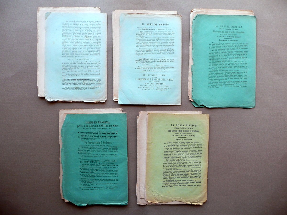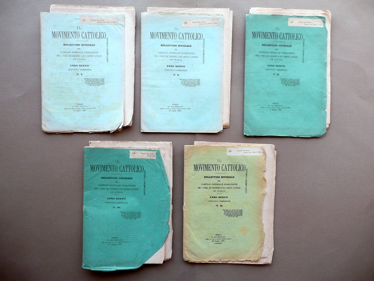Cinque bollettini, Il Movimento Cattolico" Bollettino ufficiale del Comitato Generale Permanente per l'Opera dei Congressi e dei Comitati Cattolici in Italia Anno sesto Numeri 7 - 8 - 9 - 10 - 11 Aprile - Giugno 1885 (cinque bollettini completi) Tip. dell'Immacolata, Venezia 1885; cm 24x16,5, da pag. 97 a pag. 112 (num. 7); da pag. 113 a pag. 128 (num. 8); da pag. 129 a pag. 144 (num. 9); da pag. 145 a pag. 160 (num. 10); da pag. 161 a pag. 176 (num. 11) (esemplari autonomi con numerazione progressiva); brossura ed. ma esemplari a fogli sciolti. Margine sup. della brossura ant. con applicata vecchia etichetta a stampa per spedizione postale. Cinque bollettini completi. Condizioni di conservazione Esemplari tutti complessivamente ben conservati con leggere tracce d'uso e del tempo; alcune lievi bruniture, margini delle brossure e alcuni angoli degli esemplari rispettivamente con minimi strappetti e/o piccole pieghette - tracce di pieghette; interni di qualche bollettino lievemente ingialliti a causa del tipo di carta. Poche pagine ancora intonse. Serie di cinque bollettini completi, nel quale sono trattati alcuni lavori delle varie sezioni italiane dell'Opera dei Congressi. Contenuti interessanti per la storia del Movimento Cattolico Italiano. SC03.D11836 N "