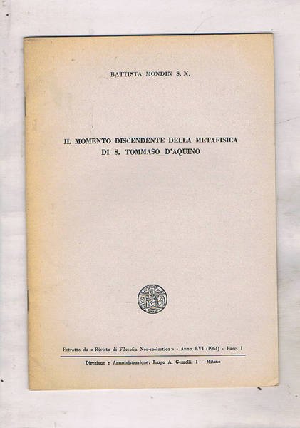 Il movimento discendente della metafisca di S. Tommaso d'Aquino. Estratto da "Rivista di Filosofia Neo-scolastica". Anno LVI 1964. Fasc. I.