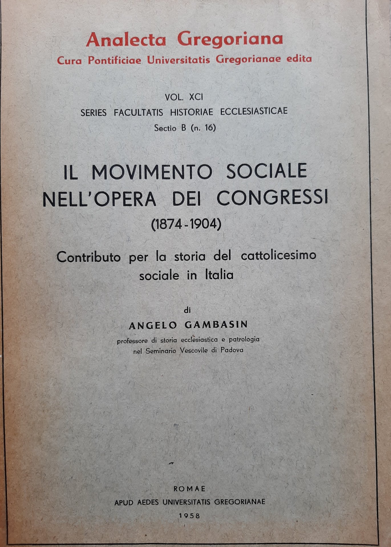 Il movimento sociale nell'opera dei congressi (1874-1904). Contributo per la storia del cattolicesimo sociale in Italia. - Analecta Gregoriana. Vol. 91. Series Facultatis Historiae Ecclesiasticae. Sectio B (n.16).