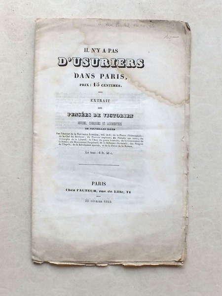 Extrait des Pensées de Victorien, revues, corrigées et augmentées de Nouvelles Idées, 1 brochure in-8, chez l'Auteur, Paris, 1844, 16 pp. Rare plaquette d'inspiration fouriériste. Etat satisfaisant (forte mouill. angulaire)