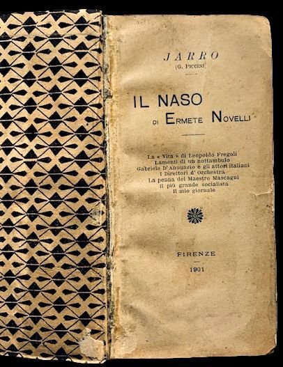 In 16°; (4), 205, (3) pp. Brossura in cartoncino. Prima edizione di questo scritto del noto scrittore e giornalista toscano, Giulio Piccini, in arte Jarro (Volterra, 1849 Firenze, 1915). Esemplare in discrete condizioni di conservazione.