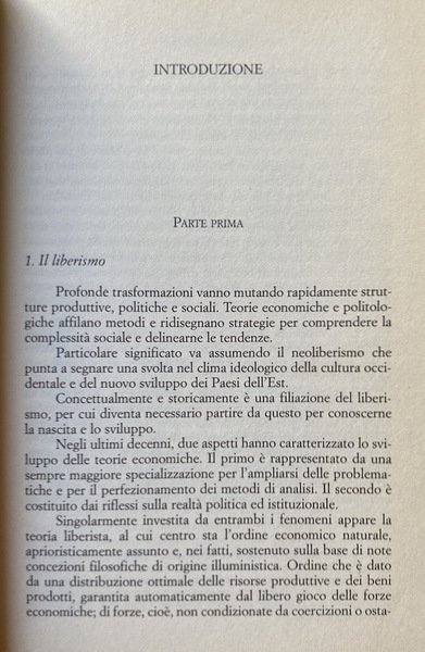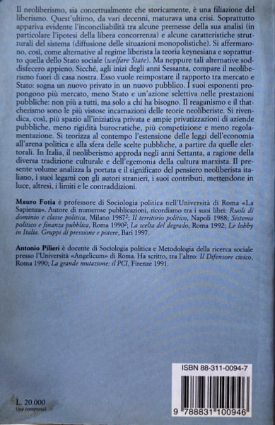 Il neoliberismo, sia concettualmente che storicamente, è una filiazione del liberismo. Quest'ultimo, da vari decenni, maturava una crisi. Soprattutto appariva evidente l'inconciliabilità tra alcune premesse della sua analisi (in particolare l'ipotesi della libera concorrenza) e alcune caratteristiche strutturali del sistema (diffusione delle situazioni monopolistiche). Si affermarono, così, come alternative al regime liberista la teoria keynesiana e soprattutto quella dello Stato sociale (welfare State). Ma neppure tali alternative soddisfecero appieno. Sicché, agli inizi degli anni Sessanta, compare il neoliberismo fuori di casa nostra. Esso vuole reimpostare il rapporto tra mercato e Stato: sogna un nuovo privato in un nuovo pubblico. I suoi esponenti propongono più mercato, meno Stato e un'azione selettiva nelle prestazioni pubbliche: non più a tutti, ma solo a chi ha bisogno. Il reaganismo e il thatcherismo sono le più vistose incarnazioni delle teorie neoliberiste. Si rivendica, così, più spazio all'iniziativa privata e ampie privatizzazioni di aziende pubbliche, meno rigidità burocratiche, più competizione e meno regolamentazione. Si teorizza al contempo l'estensione delle leggi dell'economia all'arena politica e alla sfera delle scelte pubbliche, a partire da quelle elettorali. In Italia, il neoliberismo approda negli anni Settanta, a ragione della diversa tradizione culturale e dell'egemonia della cultura marxista. Il pre sente volume analizza la portata e il significato del pensiero neoliberista italiano, i suoi legami con gli autori stranieri, i suoi contributi, mettendone in luce, altresì, i limiti e le contraddizioni.