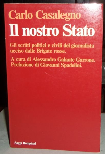 [Politica Storia - Brigate Rosse](cm. 21.5) brossura editoriale, -pp. XXXVIII+ 313. Dalla IV di copertina: Nella storia della nostra Repubblica l'uccisione di Carlo Casalegno ha un significato molto serio, che trascende la cronaca di questi anni: Ë il primo italiano assassinato per le sue idee, apertamente professate. Ma Ë un fatto che va capito fino in fondo. Chi era Casalegno? E perchÈ proprio lui Ë stato scelto dagli assassini? (.) Il mio compito Ë stato quello di offrire un ritratto, il pi˘ possibile compiuto e veritiero, del cittadino Carlo Casalegno di fronte ai problemi dello Stato, del nostro Stato, nel quale credeva, e per il quale - possiamo dirlo senza retorica - ha sacrificato la vita. Il volume raccoglie vari articoli pubblicati nella rubrica "il nostro stato" de la Stampa, sono suddivisi per argomenti: dal fascismo all'antifascismo, ai partiti, al diritto allo sciopero, i problemi della giustizia, scuola, chiesa divorzio ecc. Brunitura al taglio superiore, altrimenti perfetto. n42]