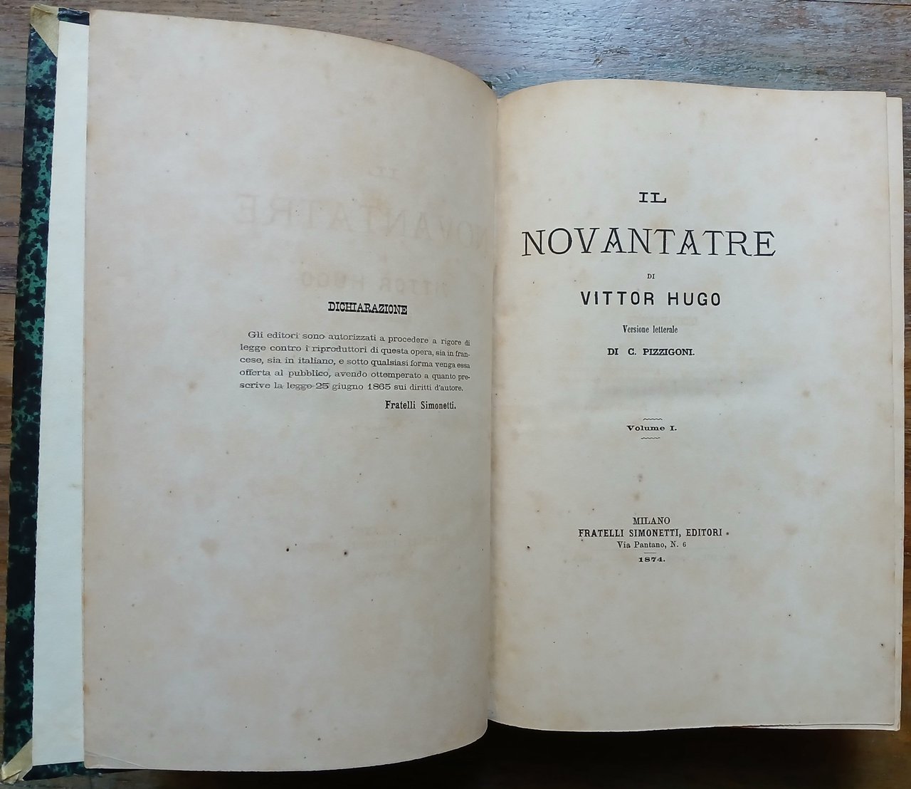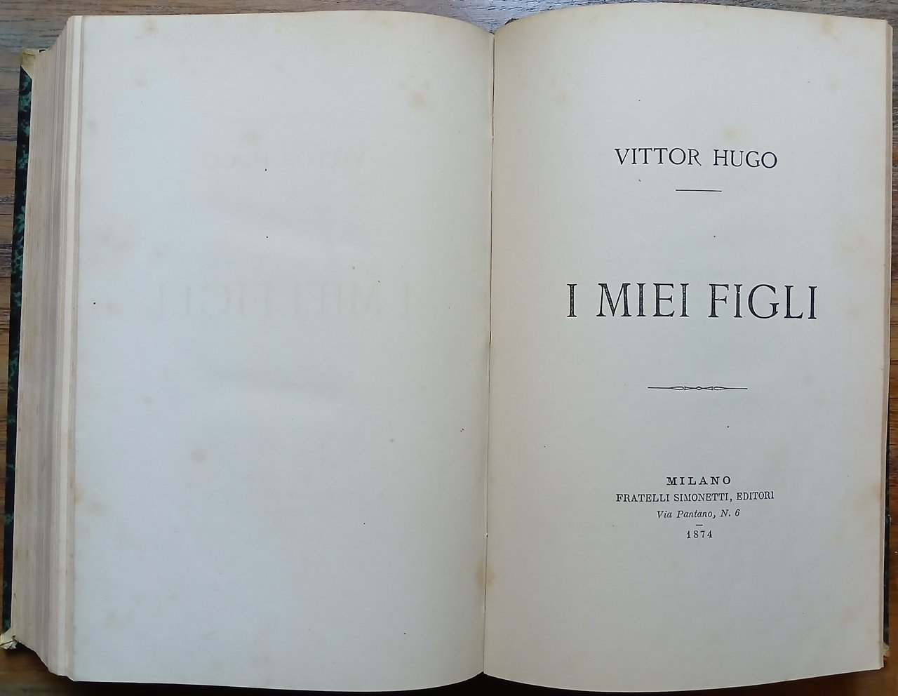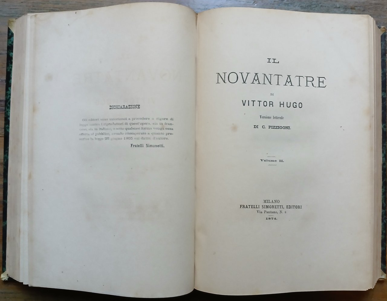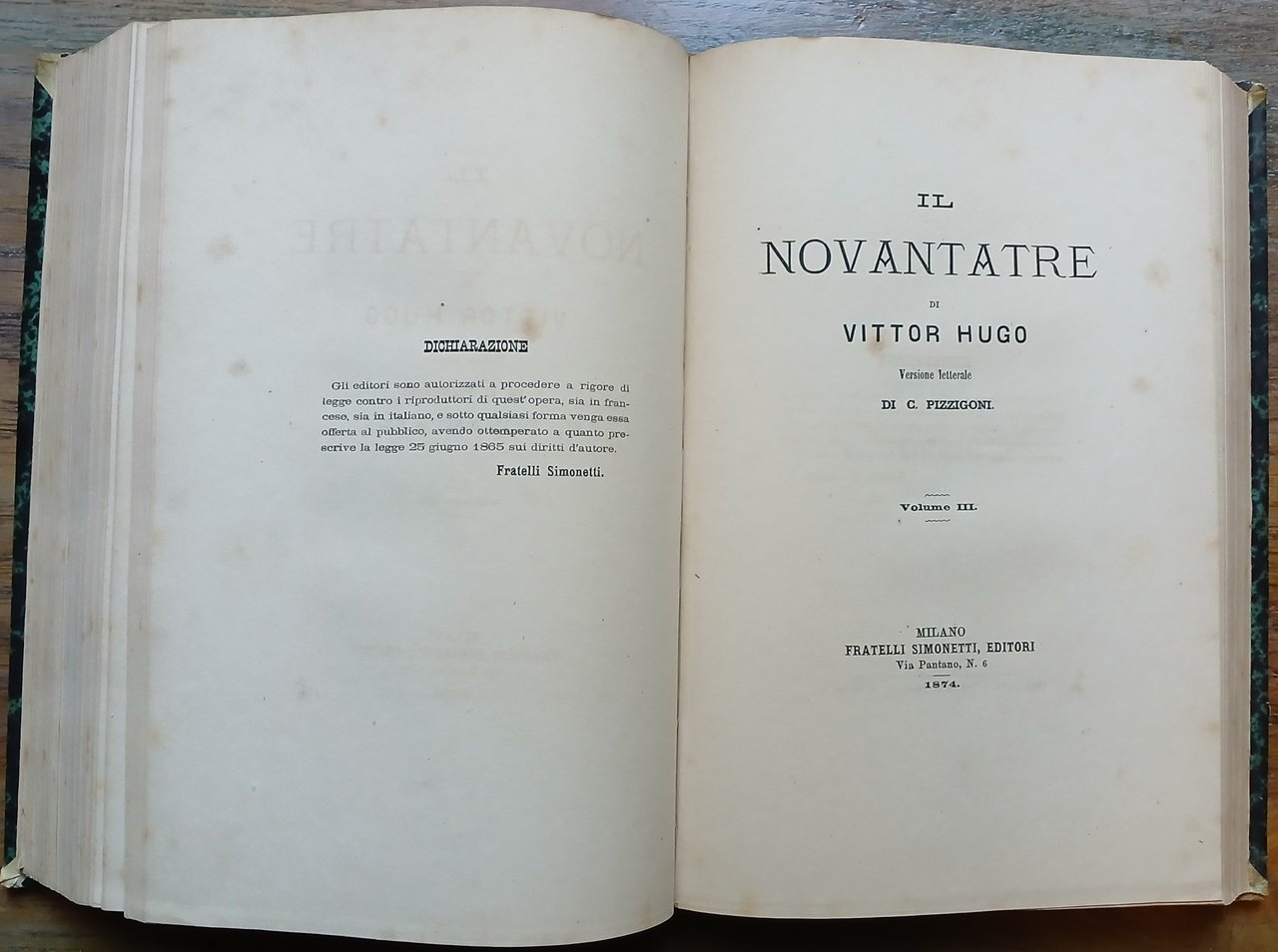 Tre volumi riuniti in un solo tomo in 8°, ognuno con proprio frontespizio, legatura coeva in mezza pelle verde con titoli ed impressioni in oro al dorso, pp. 335,(1) ; 335,(1) ; 239,(1) ; 14 n.n. (Catalogo Fratelli Simonetti), prima edizione italiana. Unito : Victor Hugo "I miei figli", Milano, Fratelli Simonetti, 1974, pp. 48, prima edizione italiana. Leggero ingiallimento della carta, peraltro ottimo stato di conservazione.