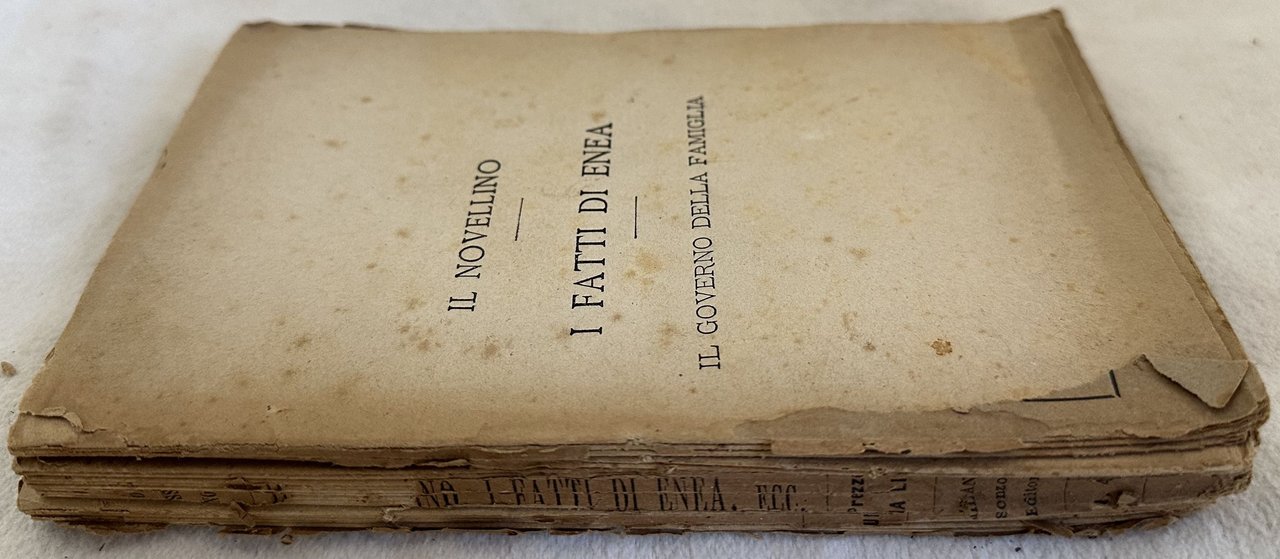 Edizione del 1879 di questa raccolta di tre opere nello stesso volume. La prima è il Novellino, una raccolta di novelle. La seconda opera una raccolta di brani tratti dall'Odissea a cura di Frate Guido da Pisa. Alla fine "il governo della famiglia" del politico Agnolo Pandolfini (1360-1446). In mediocri condizioni. Copertina editoriale in mediocri condizioni generali con usure ai margini e dorso. Piatto anteriore assente. Legatura quasi assentei. Pagine in buone condizioni con fioriture. In 16. Dim. 18,5x12,5 cm. Pp. 310. Edition of 1879 of this collection of three works bound together in the same volume. The first one is il Novellino, a collection of short novels. The second one is a collection of texts from Odissea cared by the Friar Guido da Pisa. At the end "il governo della famiglia" by the politician Agnolo Pandolfini (1360-1446). In poor conditions. Editorial cover in poor general conditions lightly worn in the extremities. Front plate lacks. Binding almost lacks. Pages are in good conditions with foxing. In 16. Dim. 18,5x12,5 cm. Pp. 310.