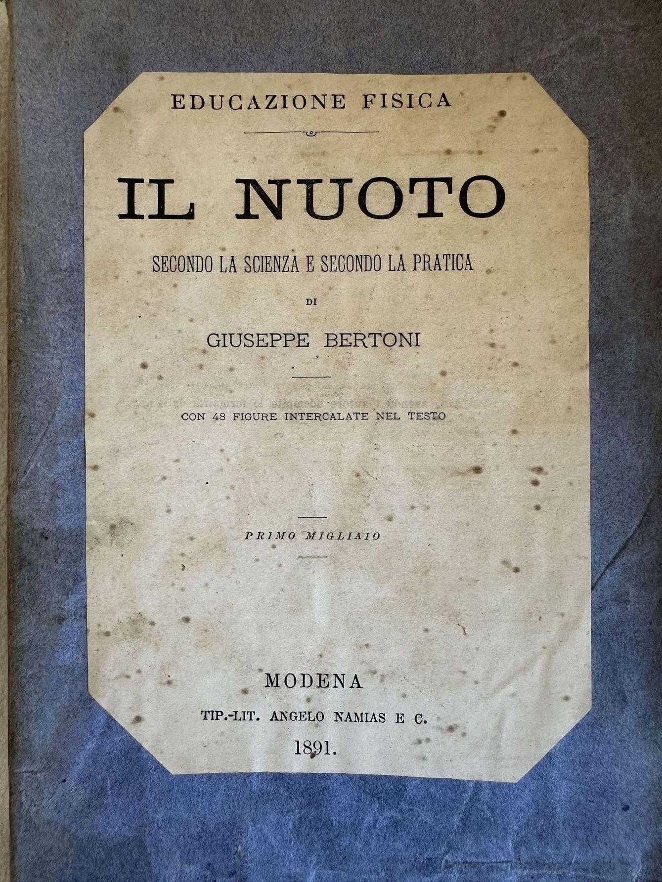 Interessante monografia del 1891 sul nuoto di Giuseppe Bertoni. L'autore descrive accuratamente il nuoto e i vari esercizi e movimenti da praticare. All'interno: Dell'arte del nuoto, del modo di entrare in acqua, Locali ed origini per l'istruzione del nuoto, Valutazione fisica, Lezioni di istruzione pratica, Perfezionamento dei movimenti, Vari modi di galleggiare e nuotare, Esercizi diversi con e senza locomozione nell'acqua, Dell'arte di saltare nell'acqua, Ordinamento della scuola di nuoto, Il nuoto nell'esercito, Il nuoto nelle scuole femminili, Soccorsi ai sommersi e cura degli annegati ec. Appendici: Misurazioni antropometriche e ricerche sull'aumento della circonferenza toracica, della capacità polmonare e della forza e suille variazioni del polso eseguite alla scuola di nuoto del Collegio San Carlo; Notizie intorno alla scuola di nuoto istituita a Modena dal Duca Francesco IV ec. Il testo è impreziosito da 48 illustrazioni. In discrete condizioni. Copertina morbida coeva con frontespizio incollato al piatto anteriore in buone condizioni generali con lievi usure ai margini e dorso. Legatura in discrete condizioni con lievi rotture e qualche pagina staccata. All'interno le pagine si presentano in buone condizioni con fioriture. In 8. cm. 22x15. Pp. XIV+(2)+242.Interesting monography of 1891 about swimming by Giuseppe Bertoni. The author accurately describes the art of swimming and its exercises. Some appendix at the end. Inside there are 48 illustrations. In fair conditions. Soft coeval cover with title page applied on front plate in good conditions lightly worn in the extremities. Binding in fair conditions with light cracks and some page detached. Inside pages are in good conditions with foxing.In 8. cm. 22x15. Pp. XIV+(2)+242.