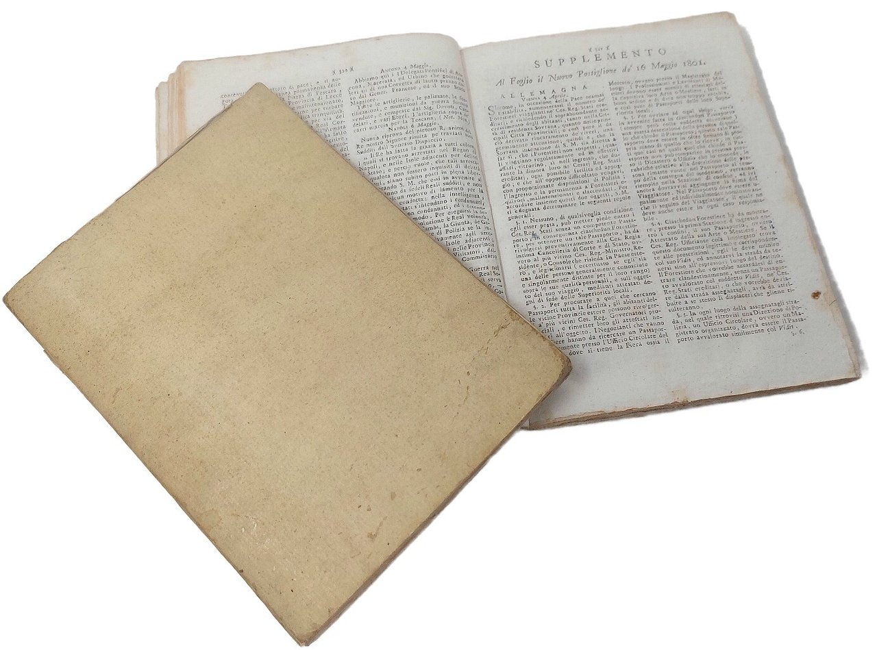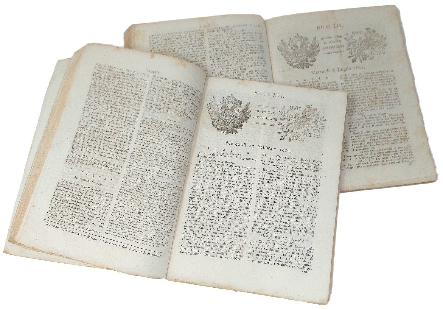 >2 volumi in-8, pp. complessive 566, cart. coevo, titolo in oro su tassello al dorso. Comprende i numeri da Gennaio ad Agosto del 1801. Rara raccolta di rivista edita dal 1741 al 1814 e contenente un sunto delle notizie più importanti o curiose avvenute nel Mondo: si tratta di un settimanale di cronaca politica e militare edito a cura di Albrizzi, Caminer e Zanetti. I numeri nel 1801 hanno cadenza bisettimanale ed il titolo è semplicemente "Il Nuovo Postiglione", che invece negli anni precedenti aveva come complementi "Novelle dal mondo" e "Compendio de' più accreditati fogli d'Europa. Buon esemplare, qualche arrossatura e forellino di tarlo qua e là. R. Saccardo, La stampa periodica veneziana fino alla caduta della Repubblica, Padova 1942, pp. 39-47