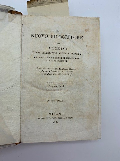 Il nuovo ricoglitore ossia archivi d'ogni letteratura antica e moderna con rassegna e notizie di libri nuovi e nuove edizioni. Anno VII. (da n. 73 gennaio 1831 a n. 84 dicembre 1831)