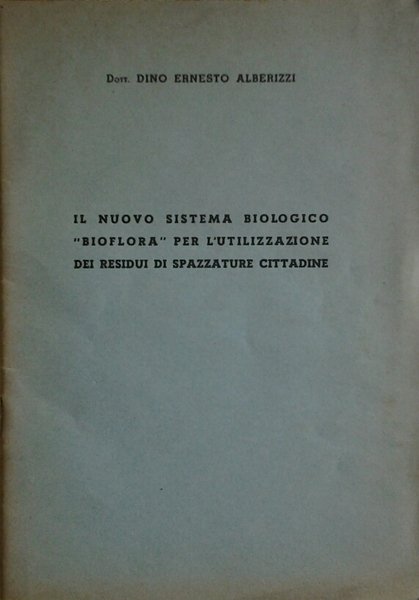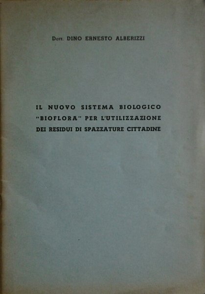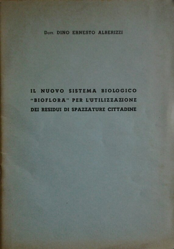 In-8, brossura originale, pp. 29, con 1 tavola in bianco e nero fuori testo e 6 tavole più volte ripiegate che rappresentano: planimetria di un impianto di bioflorizzazione, schema di impianto di triturazione e bioflorizzazione, schema esplicativo dell'impianto di bioflorizzazione, sezione di un cumulo, sistema di aerazione debole per cumuli di grandi dimensioni, schema di avanzamento di un cumulo. In buono stato (good copy).
