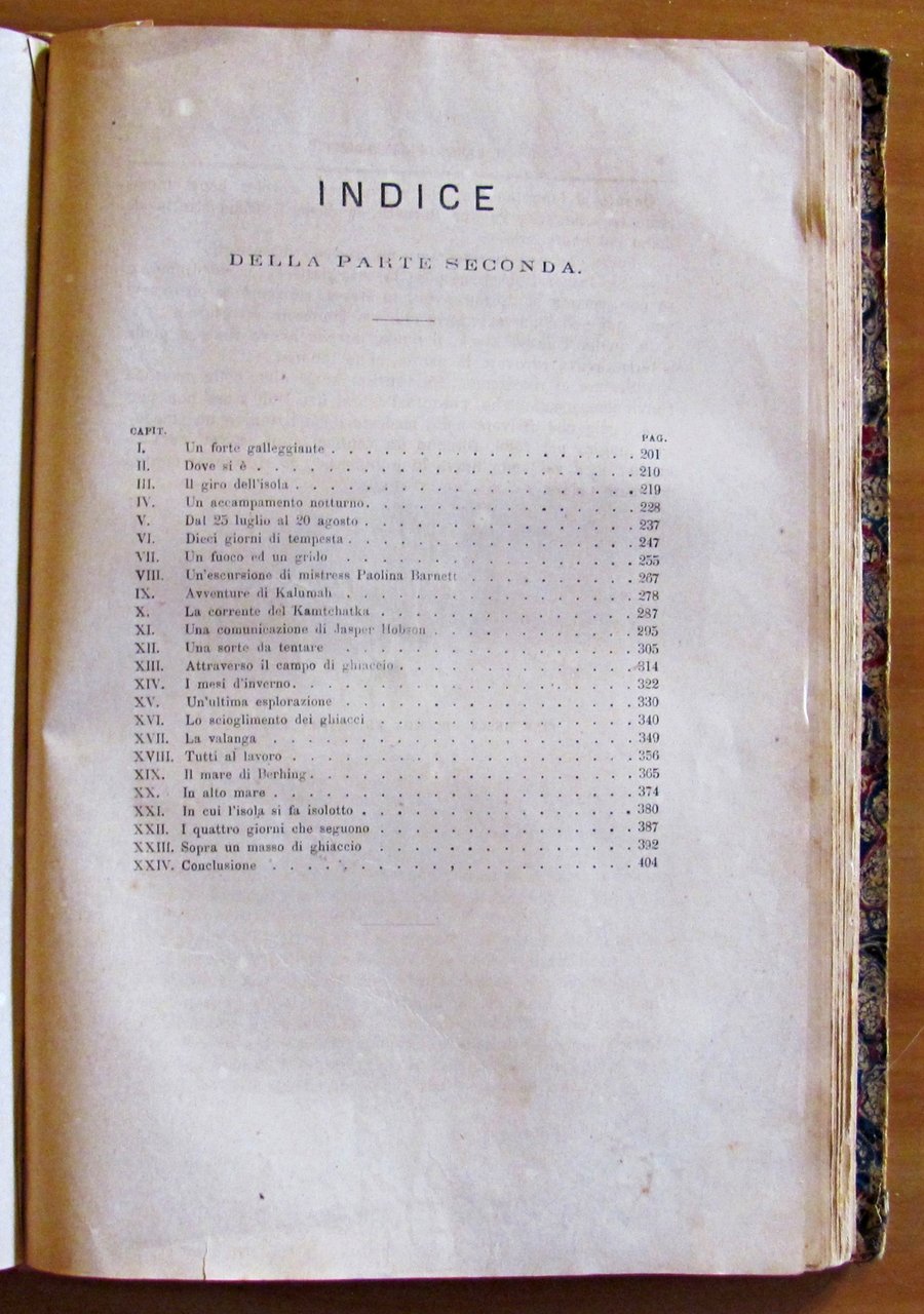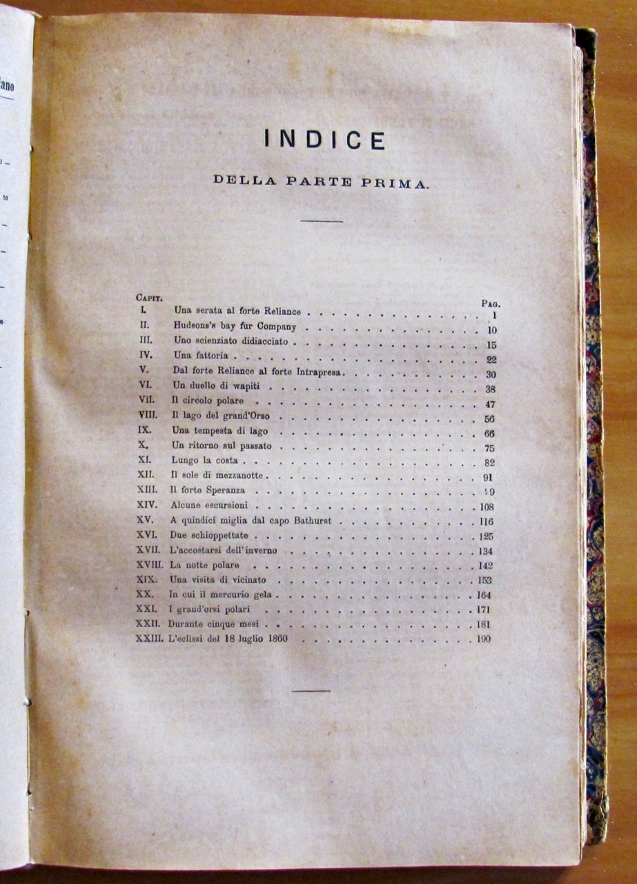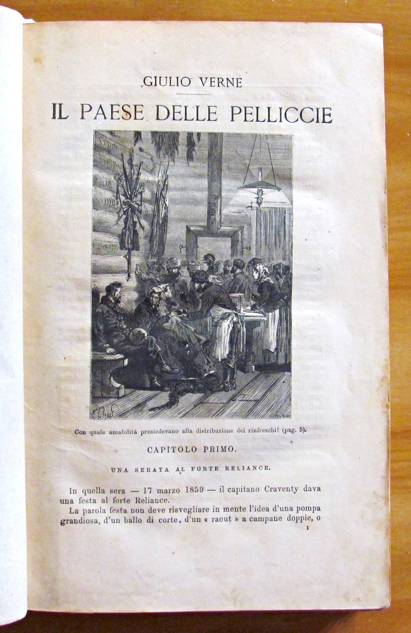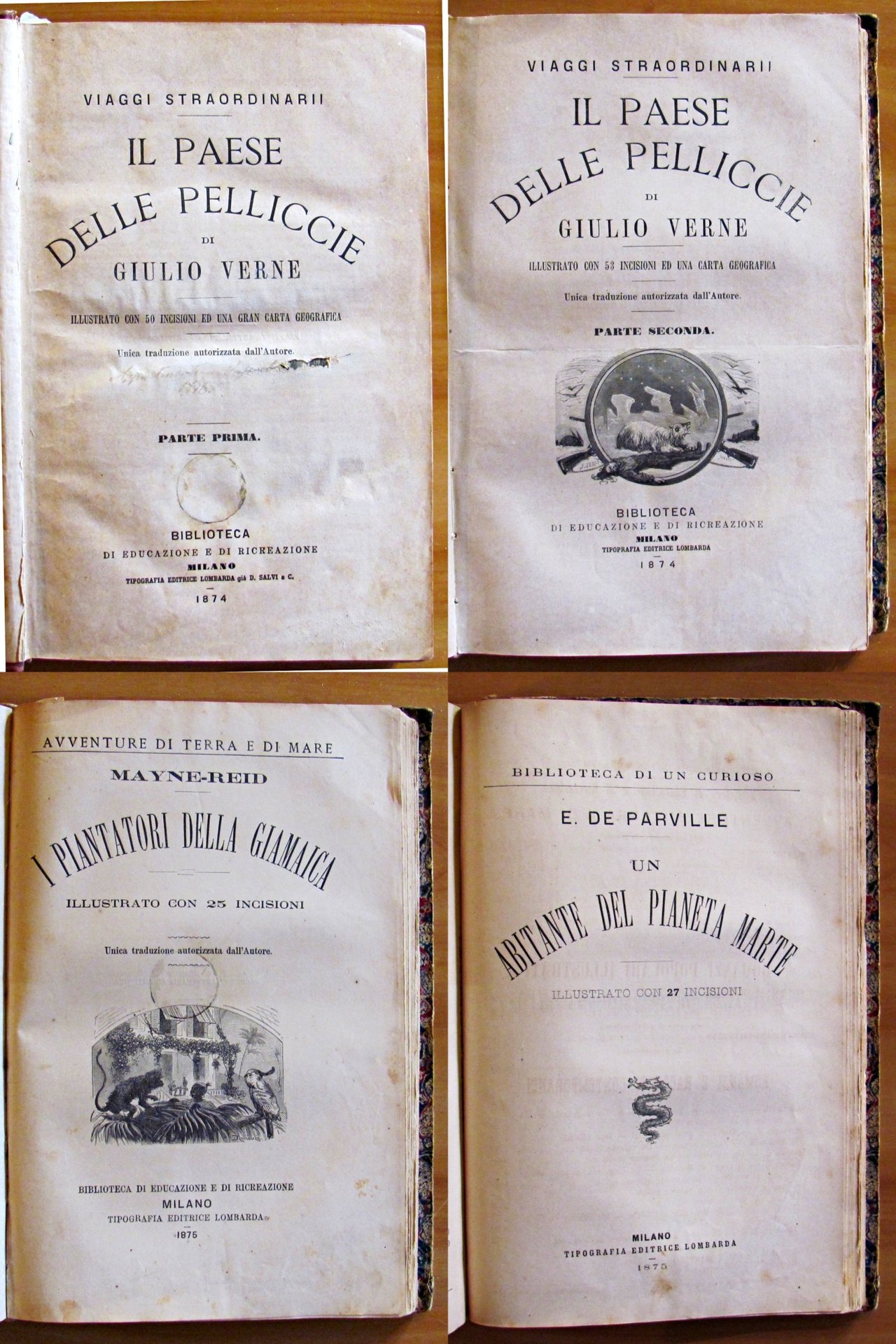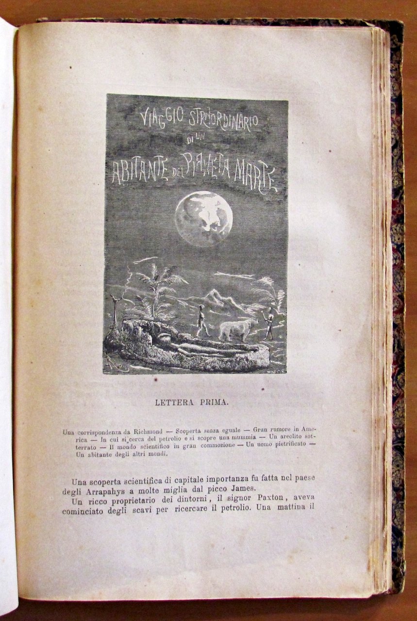Libro contenente 3 diversi racconti: Giulio Verne - Il Paese delle pelliccie (Parte Prima e Parte Seconda). Collana "Viaggi Straordinarii" con 103 incisioni in b/n di Ferat e Baurepaire. Romanzo d'avventura.; Mayne-Reid - I piantatori della Giamaica. Collana "Avventure di Terra e di Mare" con 25 incisioni in b/n di Ferat e Baurepaire. Romanzo d'avventura.; E. De Parville - Un abitante del Pianeta Marte. (Raro racconto di Protofantascienza) Biblioteca di un Curioso con 27 incisioni in b/n di Riou. Tipografia Editrice Lombarda - Milano, 1874/1875. Rilegatura coeva in mezza pelle con fregi e titoli in oro al dorso. 19x28; pp.200+406+151+115. Raro e in Buonissimo stato. , Buono (Good)