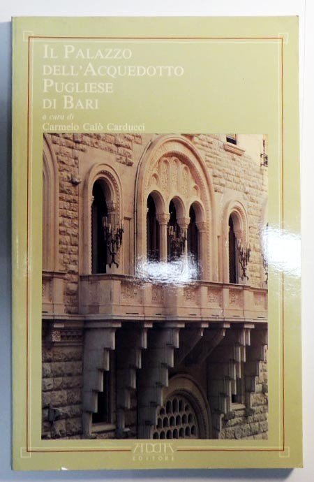 Il Palazzo dell'Acquedotto Pugliese di Bari, a cura di Carmelo Calò Carducci, testi di Antonio Rubino, Carmelo Calò Carducci, Giuseppe Calò Carducci, Mario Adda Editore, Bari 1992, pp. 101, ill. b. n. e col., cm 24, br. ed. Sommario: Antonio Rubino, Cesare Vittorio Brunetti: "L'Architetto delle acque" - Giuseppe Calò Carducci, Storie e vicende della costruzione - Il "monumento all'acqua": storia, dati, fatti - Duilio Cambellotti - Guida al palazzo – Bibliografia. Perfetto.