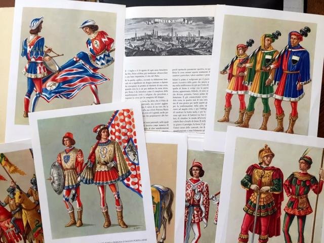 Istituto Sieroterapico e Vaccinogeno Toscano “Sclavo”, Siena, 1964 circa. Cartella di cm 22,5 x 28 circa formata da 10 pagine di testo (di cui le prime due sono la presentazione in foglio sciolto) e con 14 tavole illustrate in colore (su 17) con le contrade + 3 di figure in costume legate alla manifestazione, bross. edit. in carta. Buono stato di conservazione.