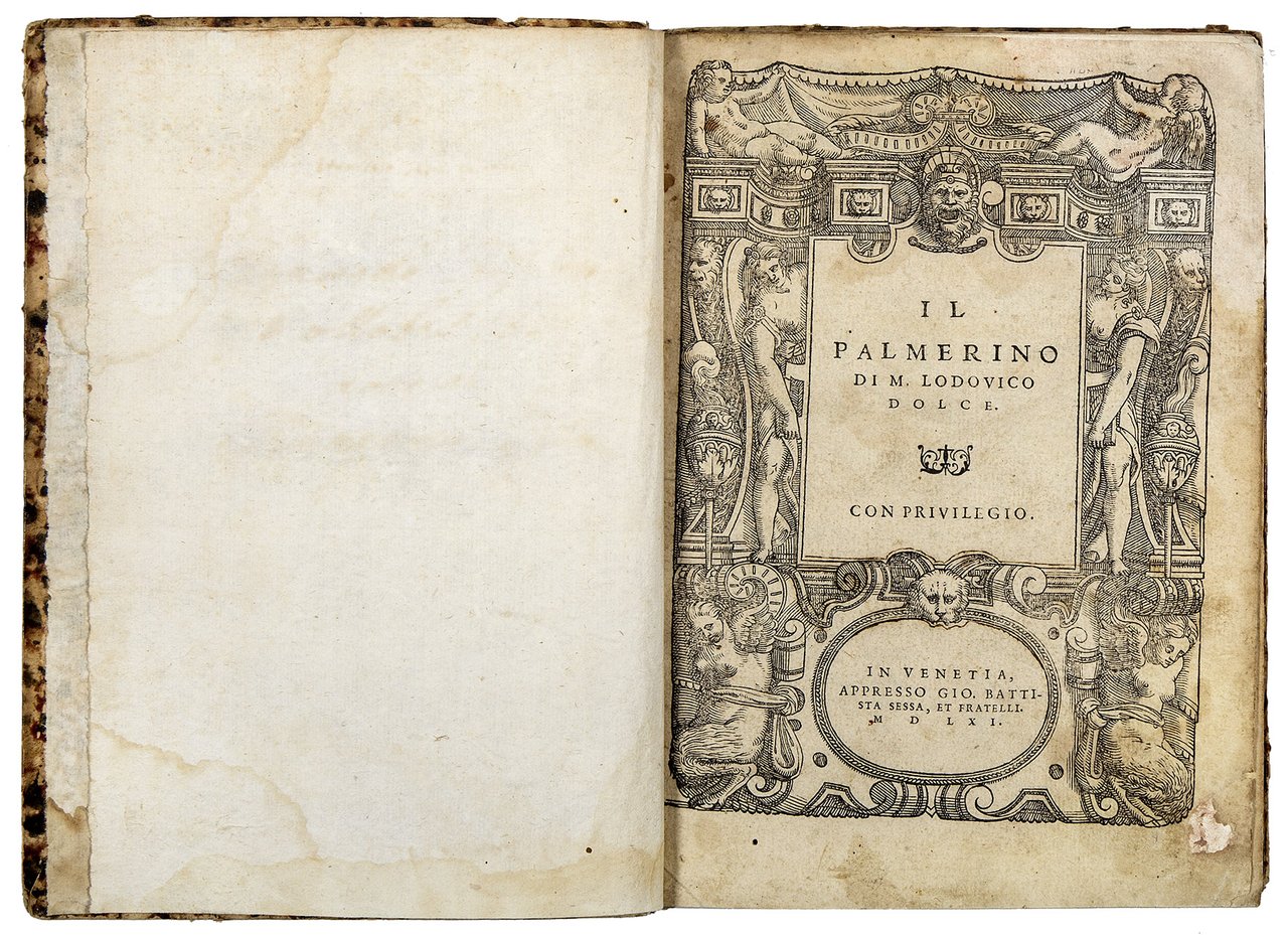 Prima edizione della versione italiana in ottava rima di questo poema cavalleresco sulle avventure di Palmerino d'Oliva, che rientra nel ciclo spagnolo e costituisce una continuazione degli Amadigi. Vi si narrano le vicende di Palmerino, figlio illegittimo ed abbandonato dell'imperatore di Bizanzio che, dopo varie avventure, eredita il regno di Costantinopoli. La versione originale spagnola in prosa venne pubblicata in Spagna nel 1511. Il rifacimento del Dolce fu ristampato postumo nel 1597 con titolo mutato, insieme al suo seguito Primaleone figliuolo di Palmerino (Venezia, 1562).