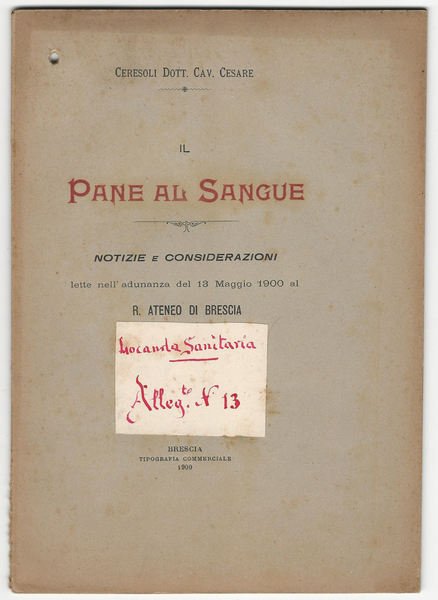 In 8, p. 46, br. orig. - Rara pubblicazione sulla pellagra.