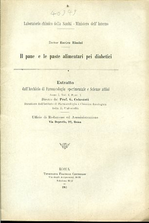 Il pane e le paste alimentari pei diabetici. Estratto dall'Archivio di Farmacologia sperimentale e Scienze affini. Anno I, vol. I, fasc. I. Laboratorio chimico della Sanità - Ministero dell'Interno