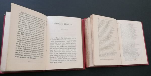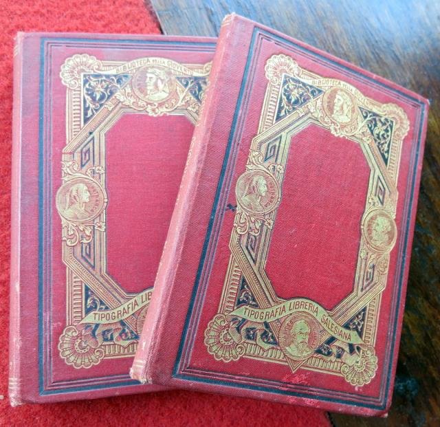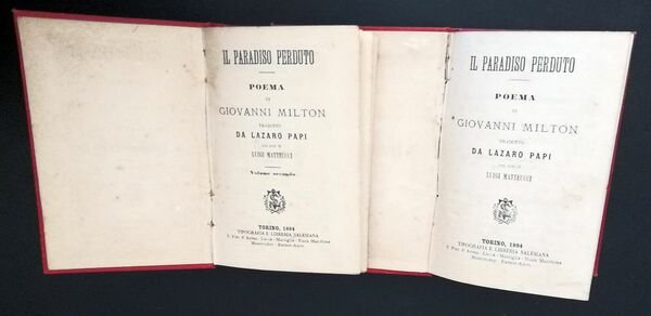 Tipografia e Libreria Salesiana, Torino, 1884. Biblioteca della Gioventù. Opera completa in due volumi in 12esimo, tradotto da Lazzaro Papi e con note di Luigi Matteucci. Al primo volumetto dedicataria al Chiarissimo Signor Professore Professore D. Celestino Durando dal Dev.mo Oss.mo Servitore Luigi Matteucci, Cenni biografici di Giovanni Milton e Cenni biografici di Lazaro Papi. pp. 235; il secondo volumetto pp. 246, leg. originali in t. percall. rossa con impressioni e decori oro a entrambi i piatti. Usuale ingiallimento e usuali minimi difetti del tempo (non degni di nota), piacevole edizione in buono stato di conservazione.
