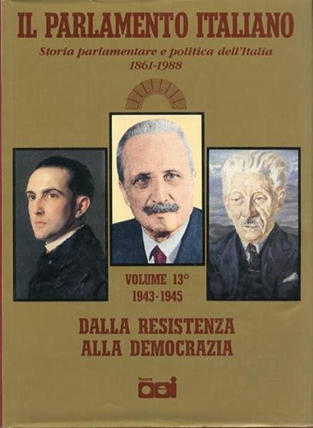 XIX, 624 p. : ill. ; 31 x 23 cm. Sommario: Cronologia storico-parlamentare 1943-1945; I partiti dall'antifascismo di fronte alla costituzione dello Stato democratico; Il nodo istituzionale (1943-1946); La Consulta nazionale e la legislazione transitoria; Da Badoglio a Parri; L'avvento di De Gasperi alla guida del governo; I problemi della ricostruzione. I protagonisti del Parlamento: Umberto II; Enrico De Nicola; Ferruccio Parri; Ignazio Silone; Emilio Lussu; Mauro Scoccimarro; Achille Grandi; Marcello Soleri; Ivanoe Bonomi. Bibliografia; Gli autori del tredicesimo volume; I presidenti e i vicepresidenti del Senato regio, dal maggio 1848 al giugno 1946; Indice dei nomi e dei luoghi; Indice iconografico. Legatura editoriale, coperta in cartone rigido foderato di similpelle di colore rosso scuro (bordò), titolo impresso in oro al piatto e al dorso. Sovraccoperta illustrata a colori in carta patinata lucida. All'interno numerose illustrazioni a colori su carta patinata. Codice libreria 6036.