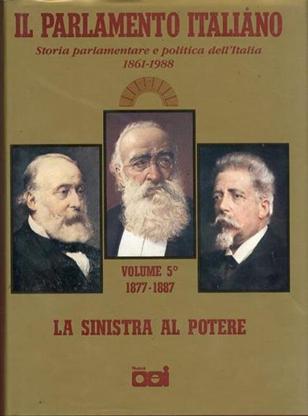 XIX, 654 p. : ill. ; 31 x 23 cm. Sommario: Cronologia storico-parlamentare 1877-1887; Le ragioni di un cambiamento; Le riforme elettorali del 1882; La successione dei governi di Agostino Depretis (1876-1877) e la pratica del trasformismo; La legge sulla scuola; La politica estera tra Parlamento e Paese da Depretis a Crispi; L'inchiesta sulle condizioni igienico-sanitarie del Regno; L'inchiesta sulle Opere Pie (1880-1888) e la legge Crispi del 1890. I protagonisti del Parlamento: Agostino Depretis; Giovanni Nicotera; Luigi Amedeo Melegari; Agostino Magliani; Benedetto Cairoli; Francesco De Sanctis; Cesare Correnti; Agostino Bertani; Pasquale Stanislao Mancini: Guglielmo Boccardo. Bibliografia; Gli autori del quinto Volume; Elenco dei senatori e deputati della XIV, XV e XVI Legislatura; indice dei nomi e dei luoghi; Indice iconografico. Contiene interventi di Pier Carlo Masini, "La Banda del Matese"; "L'attentato di Passanante"; "Carlo Cafiero". Legatura editoriale, coperta in cartone rigido foderato di similpelle di colore rosso scuro (bordò), titolo impresso in oro al piatto e al dorso. Sovraccoperta illustrata a colori in carta patinata lucida. All'interno numerose illustrazioni a colori su carta patinata. Codice libreria 6027.