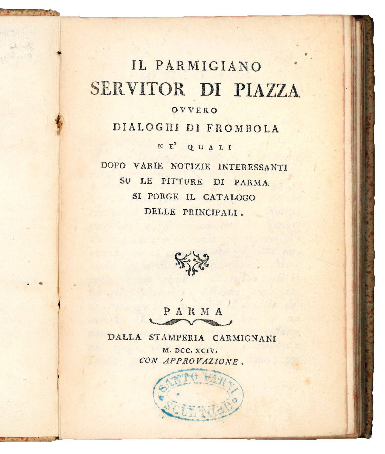 Il Parmigiano servitor di piazza, ovvero Dialoghi di Frombola ne' quali dopo varie notizie interessanti su le pitture di Parma si porge il catalogo delle principali