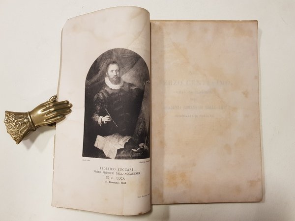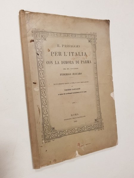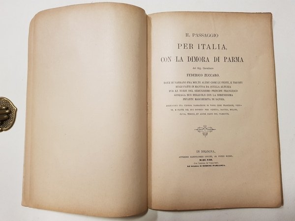 Nuova edizione dell'opera: <BR>Il passaggio per l'Italia con la dimore in Parma del Sig. Cavaliere Federigo Zuccaro. Dove si narrano fra molte altre cose le feste, e trionfi regij fatti in Mantoa da quella Altezza per le nozze del Serenissimo Principe Francesco Gonzaga suo figliuolo con la Serenissima Infante Margherita di Savoia. Aggiuntoui una copiosa narratione di varie cose trascorse, vedute, e fatte nel suo diporto per Venetia, Mantoa, Milano, Pavia Turino, et altre parti del Piamonte.<BR>In Bologna, presso Bartolomeo Cocchi al Pozzo Rosso, MDCVIII<BR>Cm. 26 x 17; pp. 100 con 2 tavole litografiche fuori testo (1 ritratto di Federico Zuccari e 1 veduta di Casa Zuccari in Sant Angelo in Vado); brossura editoriale; cucito.<BR>CONDIZIONI DISCRETE: alcuni strappetti con piccole perdite alla copertina; piatto posteriore posticcio; alcuni aloni alle primissime pagine; ingiallitura delle pagine dovuta alla qualità della carta.<BR>Parzialmente intonso.