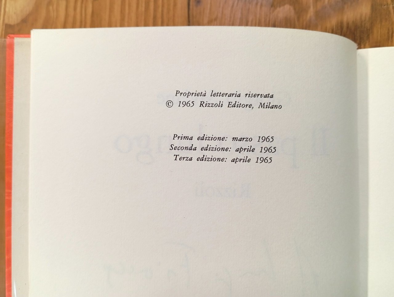 Terza edizione, un mese dopo la prima. Collana "La Scala". Al frontespizio, dedica e firma dell'Autore a Luigi Fiocca, giornalista vicino al milieu politico e culturale romano dagli anni sessanta in poi - Volume cartonato con copertina illustrata a colori, acetato protettivo trasparente, 243 pagine. Tenue brunitura al dorso, peraltro ottima copia.