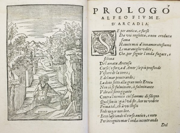 In-16 gr. (mm. 190x134), 2 opere in 1 volume, legatura coeva in p. pelle con eleganti e ricche cornici dorate ai piattti, dorso a cordoni con decoraz. e titolo oro, cc.nn. 7 (frontesp. con marca tipograf., dedica a Vincenzo Gonzaga, argomento, ritratto del Guarini, Persone che parlano'), a p. 7 comincia il Prologo e la Tragicommedia finisce alla p. 298 (mal numer. 198). Le 4 cc.nn. che seguono contengono il frontespizio delle "Rime", la dedicatoria al Card. Pietro Aldobrandini, un sonetto dell'A. e una lettera dello stampatore ai lettori. Le Rime iniziano a p. 207 (i.e. 307) e terminano a p. 329 (i.e. 429); le ultime 7 pp. sono di Indici. Il testo è decorato con fregi, grandi capilettera figurati a vignetta e finalini inc. su legno.Le tavole che la ornano, xilografate nel testo, sono 6 (incluso il Prologo), in parte copiate da quelle delle stampe precedenti intagliate in rame.In questa ricercata, ma poco corretta ristampa, furono bensì aggiunte le "Rime" dell'A., ma dall'altro canto furono tolte via le Annotazioni' ch'erano impresse al fine di ciascuna scena nelle anteriori ediz. del Ciotti.Ebbe il Guarini la non ordinaria soddisfazione di vedere questa sua famosa Tragicommedia, durante il tempo in cui visse, trasportata in straniere lingue e ristampata per ben 30 volte. Pochi libri italiani trovarono poi tanto ricetto e onore tra i forestieri da farne in ogni tempo pregevoli e splendide stampe. Così Gamba,557.E' infatti la pastorale più importante dopo l'Aminta e con quella apre la numerosa serie di questo genere teatrale che nel Seicento ebbe il suo maggior sviluppo e la migliore fortuna.Corto di margini; con qualche lieve alone; ca. 20 carte con fori di tarlo al marg. interno che talvolta intaccano lettere del testo, ma complessivam. un discreto esemplare.