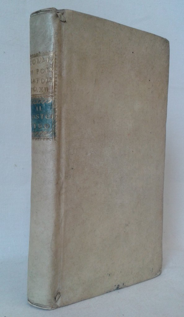 Volume in 12 grande (pieni margini) legato in pergamena, titolo ai tasselli al dorso, tagli spruzzati, sguardie, occhiello, frontespizio, 252 pp. Eccellente edizione settecentesca di un rutilante classico tradotto in napoletano gi nel XVII secolo, a poco meno di venticinque anni dall'Editio princeps guariniana. Questa riproposizione ne sancisce la forza poetica e l'ampiezza evocativa: di solito, le traduzioni dialettali hanno vita breve ed effimera, ristrette come sono da una questione fonetica. Sempre che non vi sia aura di geniale capacit, che in questo caso pi che presente. Raro a reperirsi, il volume in ottimo stato