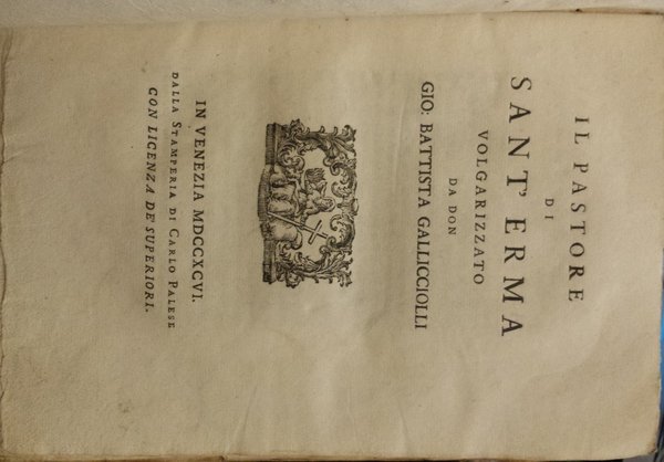 In-8 (23 cm) XIX (5) 175 (3). Marca editoriale. Cartoncino rustico, rinforzato e decorato al dorso. Il Pastore di Erma è un testo paleocristiano di genere apocalittico, composto nella prima metà del II secolo. Prende il nome dal personaggio principale della Visione V, l'Angelo della Penitenza, il quale appare ad Erma nelle vesti di pastore. Gio. Battista Gallicciolli (1733-1806): sacerdote; ha fatto studi di teologia, filosofia, lingua e letteratura latina e greca; orientalista. Noto e apprezzato specialista in lingua e filologia ebraica. Nato e morto a Venezia.