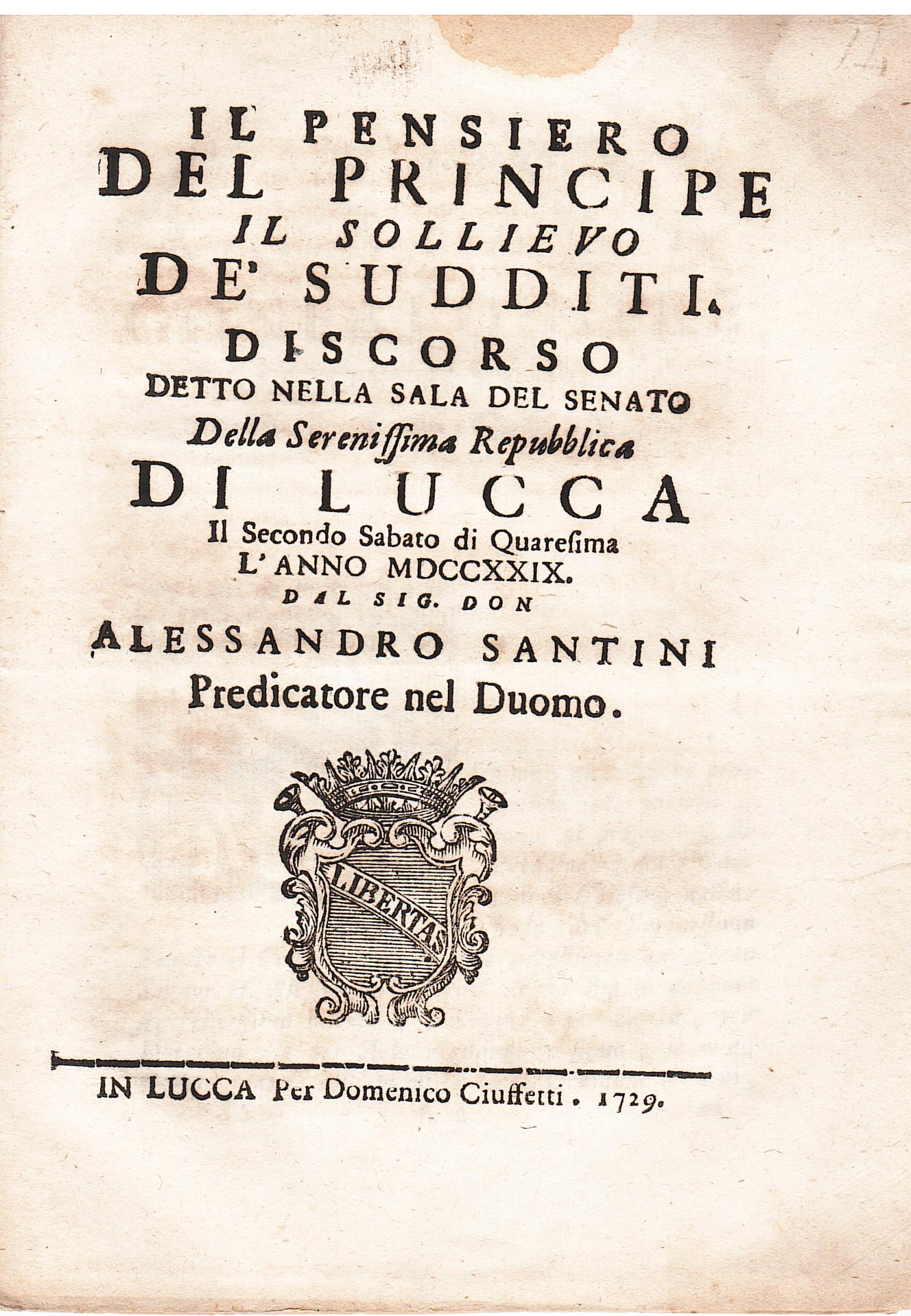 8° senza legat. pp. 18, stemma xilogr. al frontesp. e grande capolettera figur. Lieve aloncino marg. al front. ma buon es.
