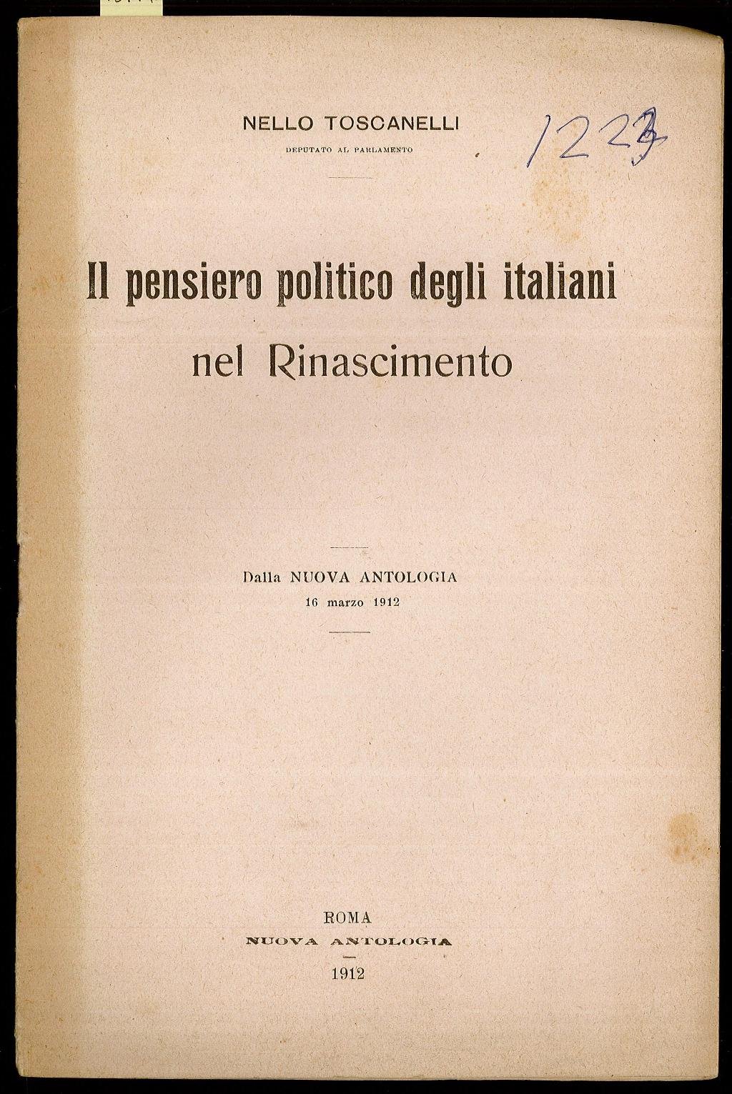 Opuscolo vintage. Estratto dalla Nuova Antologia 16 marzo 1912. Dorso ingiallito. Ordinario segno del tempo.