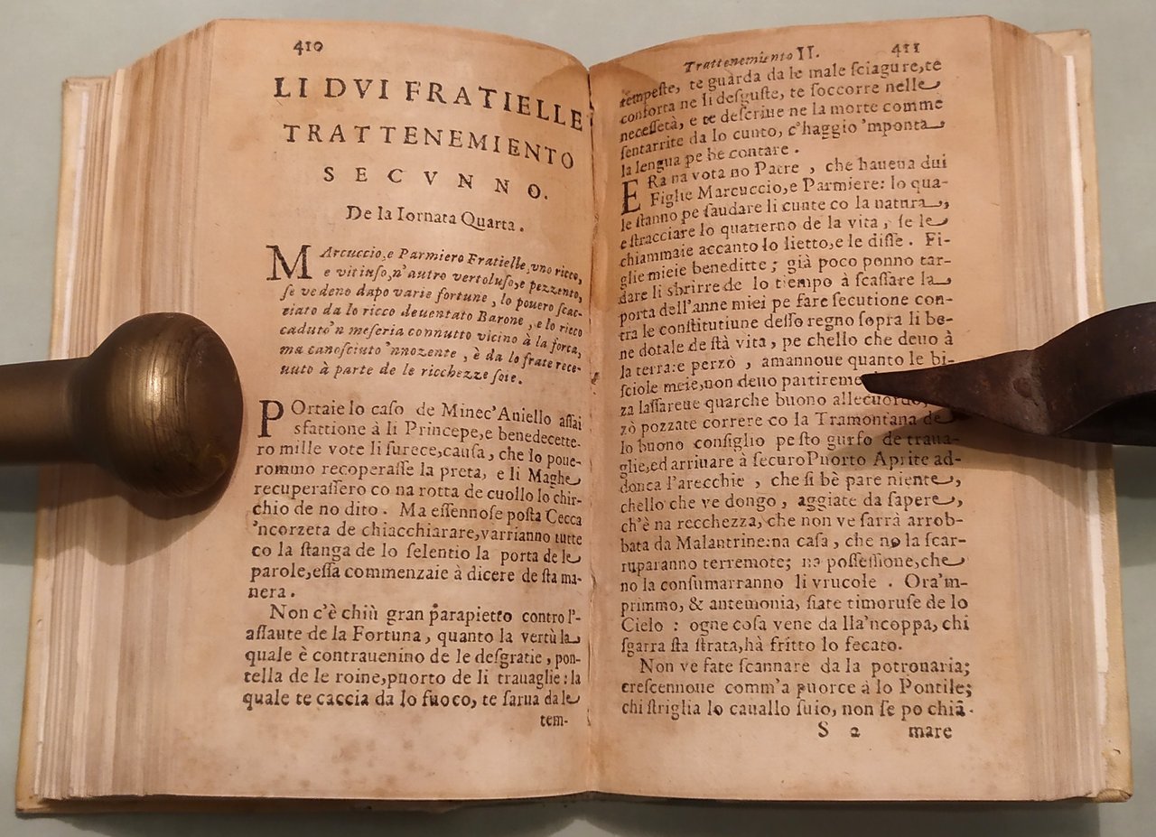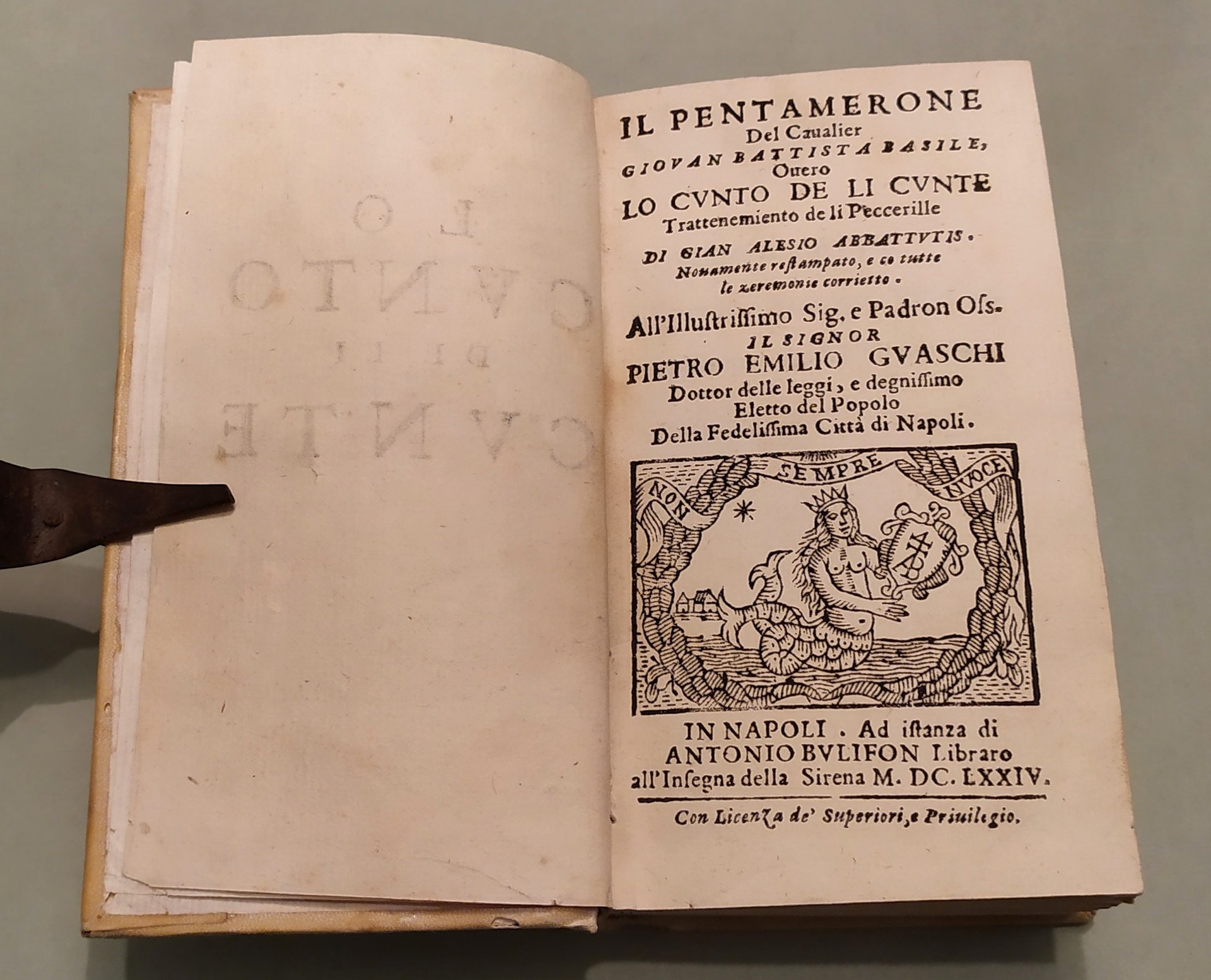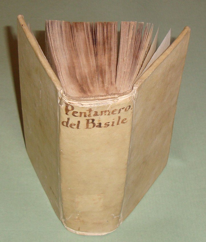 In Napoli, ad istanza di Antonio Bulifon libraro all'Insegna della Sirena, 1674. In 16mo; pp.12n.nn., 633, 3n.nn. Pergamena coeva, titolo calligrafato al dorso. Ex libris. Rara e celebre raccolta di fiabe in dialetto napoletano, la più antica opera di racconti fiabeschi e tradizioni popolari della storia europea. In questa edizione compare per la prima volta il titolo "Pentamerone". Lo Cunto de li Cunte ebbe grande influenza in tutta Europa su scrittori come C. Brentano, i fratelli Grimm, Perrault, Carlo Gozzi, Wieland. Dall'introduzione di Benedetto Croce all'edizione del 1891: "Il Cunto de li Cunti è un libro di fiabe. E le fiabe, non occorre quasi il dirlo, sono racconti popolari tradizionali di avventure, alle quali pigliano parte esseri umani, ed esseri sovraumani od estraumani della mitologia popolare, come fate, orchi, animali parlanti, ecc. Questo complesso di racconti tradizionali, la cui origine è incerta e discussa e risale senza dubbio a una remota antichità, viene ora considerato dalla moderna filologia come un gruppo di documenti importanti per la storia del genere umano e per la psicologia popolare. Ma, per molti secoli, essi non furono se non un oggetto di diletto e di trattenimento pel popolo ingenuo e pei fanciulli, che avidamente li ascoltavano: lo scienziato disdegnava d'appressarvisi, e solo, di rado, vi si appressò l'artista. E uno dei primi artisti, anzi il primo, che vi si appressasse, fu appunto il nostro Giambattista Basile. Nel 1674 l'editore Antonio Bulifon, un francese stabilito a Napoli, «vedendo, com’egli stesso dice, che veniva sommamente desiderato questo, altrettanto arguto quanto giocoso, Pentamerone del vivace e bizzarro ingegno del Cavalier Giovan Battista Basile», fece sì che, «ridotto alla vera lettione, per mezzo delle stampe ei rinascesse». Chi lo ridusse alla «vera lettione» fu un abate pugliese, Pompeo Sarnelli, poi vescovo di Bisceglie, appassionato cultore del dialetto napoletano, che allora serviva, a quanto sembra, da correttore nella stamperia del Bulifon. Il Cunto de li Cunti fu, in quest'edizione, intitolato, per la prima volta, sul frontespizio: Il Pentamerone: titolo più breve, che ricorda illustri precedenti, e che perciò prevalse. Ed, anche sul frontespizio, è detto «co tutte le zeremonie corrietto»; e, certo, il Sarnelli vi spese intorno molte cure". Le cinquanta fiabe delle cinque giornate sono tutte collegate tra loro, e racchiuse in una cornice generale, che ravvicina questo libro di fiabe ai più classici libri italiani di novelle, ai Decameron, alle Cene, ai Diporti, alle Piacevoli Notti, ecc. Pironti, Editori francesi in Napoli, pag.87.