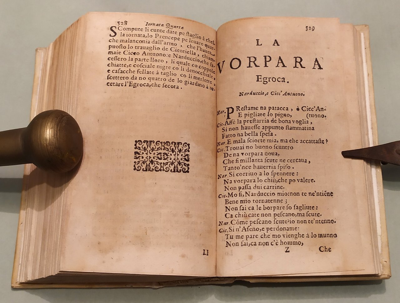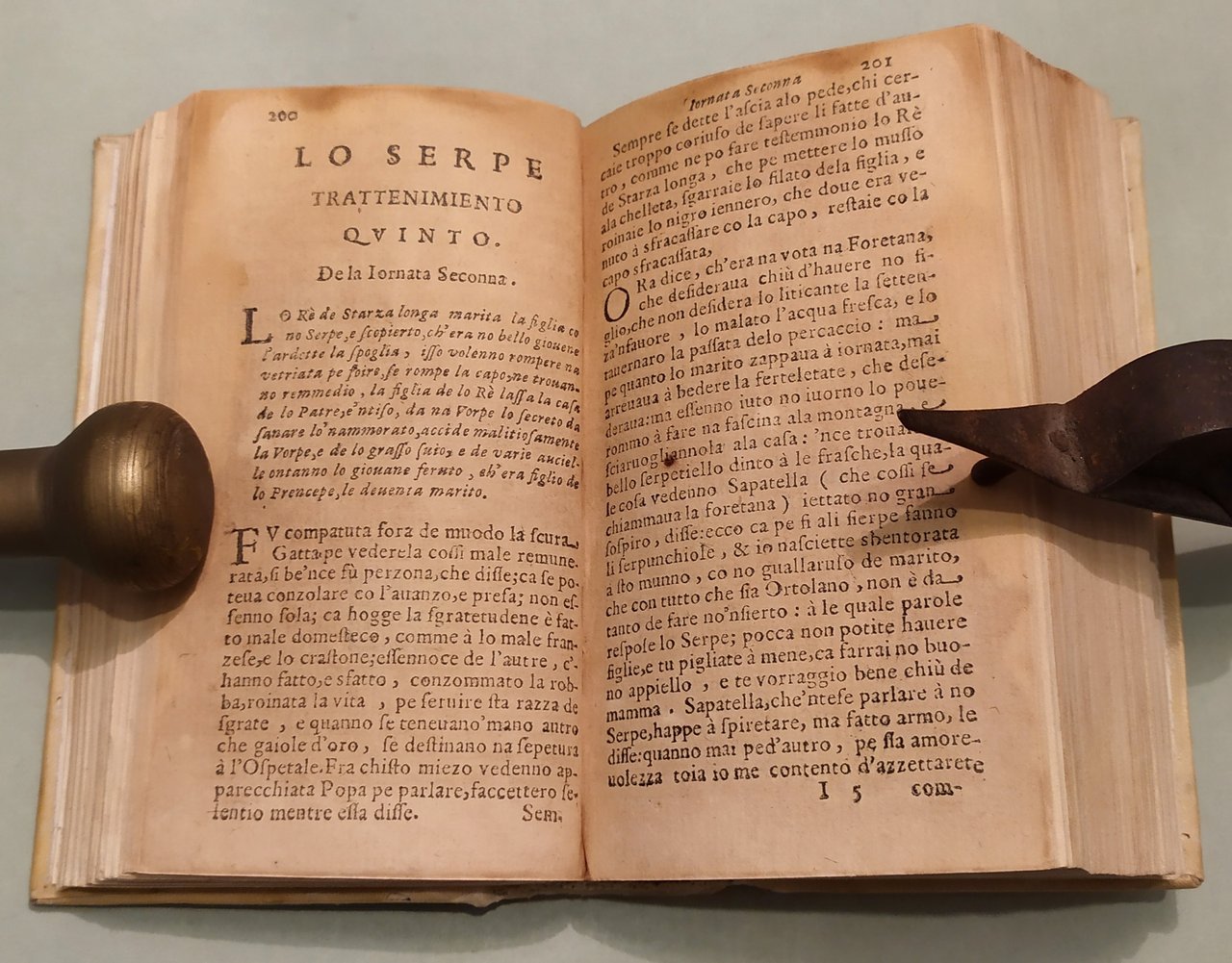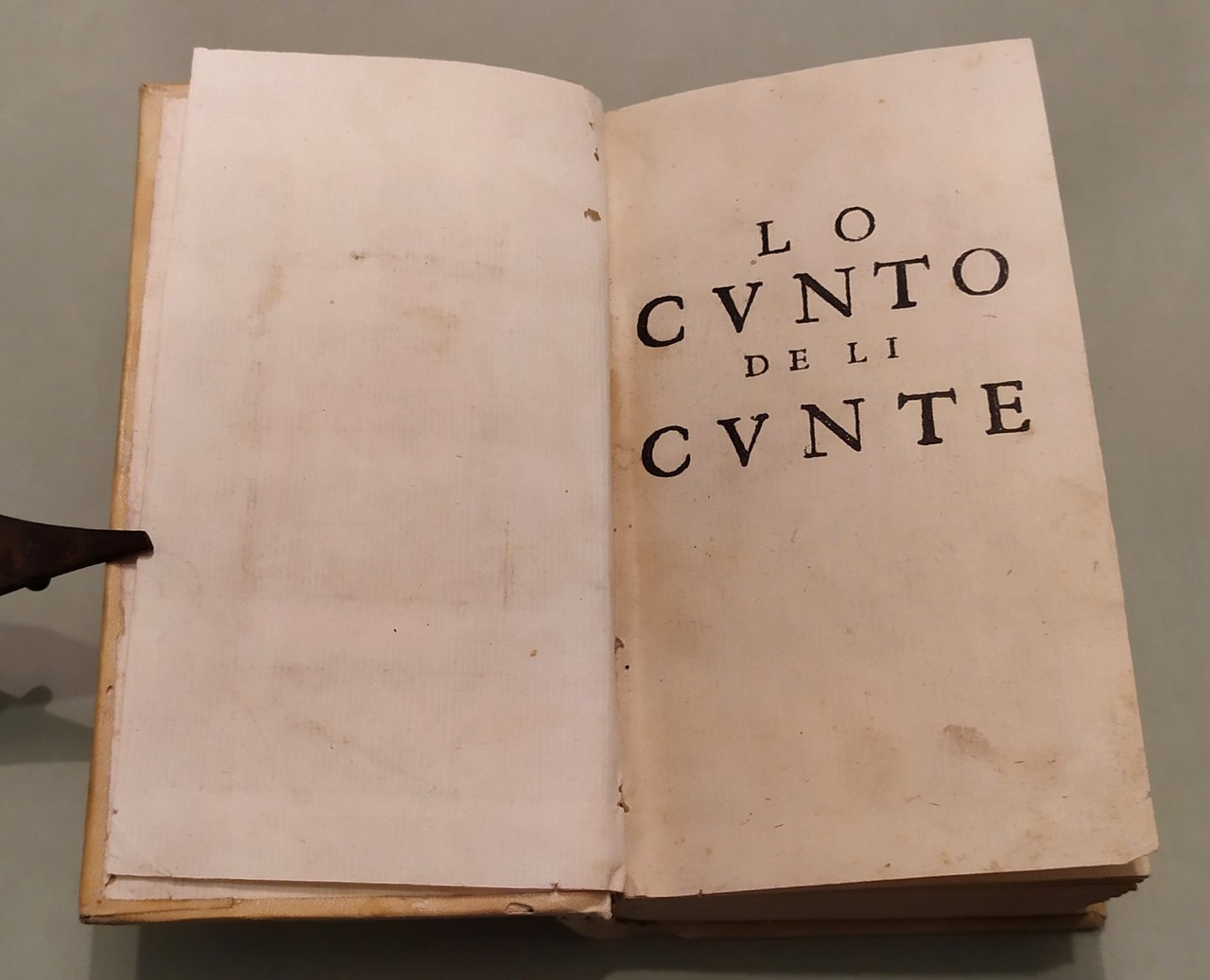 In Napoli, ad istanza di Antonio Bulifon libraro all'Insegna della Sirena, 1674. In 16mo; pp.12n.nn., 633, 3n.nn. Pergamena coeva, titolo calligrafato al dorso. Ex libris. Rara e celebre raccolta di fiabe in dialetto napoletano, la più antica opera di racconti fiabeschi e tradizioni popolari della storia europea. In questa edizione compare per la prima volta il titolo "Pentamerone". Lo Cunto de li Cunte ebbe grande influenza in tutta Europa su scrittori come C. Brentano, i fratelli Grimm, Perrault, Carlo Gozzi, Wieland. Dall'introduzione di Benedetto Croce all'edizione del 1891: "Il Cunto de li Cunti è un libro di fiabe. E le fiabe, non occorre quasi il dirlo, sono racconti popolari tradizionali di avventure, alle quali pigliano parte esseri umani, ed esseri sovraumani od estraumani della mitologia popolare, come fate, orchi, animali parlanti, ecc. Questo complesso di racconti tradizionali, la cui origine è incerta e discussa e risale senza dubbio a una remota antichità, viene ora considerato dalla moderna filologia come un gruppo di documenti importanti per la storia del genere umano e per la psicologia popolare. Ma, per molti secoli, essi non furono se non un oggetto di diletto e di trattenimento pel popolo ingenuo e pei fanciulli, che avidamente li ascoltavano: lo scienziato disdegnava d'appressarvisi, e solo, di rado, vi si appressò l'artista. E uno dei primi artisti, anzi il primo, che vi si appressasse, fu appunto il nostro Giambattista Basile. Nel 1674 l'editore Antonio Bulifon, un francese stabilito a Napoli, «vedendo, com’egli stesso dice, che veniva sommamente desiderato questo, altrettanto arguto quanto giocoso, Pentamerone del vivace e bizzarro ingegno del Cavalier Giovan Battista Basile», fece sì che, «ridotto alla vera lettione, per mezzo delle stampe ei rinascesse». Chi lo ridusse alla «vera lettione» fu un abate pugliese, Pompeo Sarnelli, poi vescovo di Bisceglie, appassionato cultore del dialetto napoletano, che allora serviva, a quanto sembra, da correttore nella stamperia del Bulifon. Il Cunto de li Cunti fu, in quest'edizione, intitolato, per la prima volta, sul frontespizio: Il Pentamerone: titolo più breve, che ricorda illustri precedenti, e che perciò prevalse. Ed, anche sul frontespizio, è detto «co tutte le zeremonie corrietto»; e, certo, il Sarnelli vi spese intorno molte cure". Le cinquanta fiabe delle cinque giornate sono tutte collegate tra loro, e racchiuse in una cornice generale, che ravvicina questo libro di fiabe ai più classici libri italiani di novelle, ai Decameron, alle Cene, ai Diporti, alle Piacevoli Notti, ecc. Pironti, Editori francesi in Napoli, pag.87.