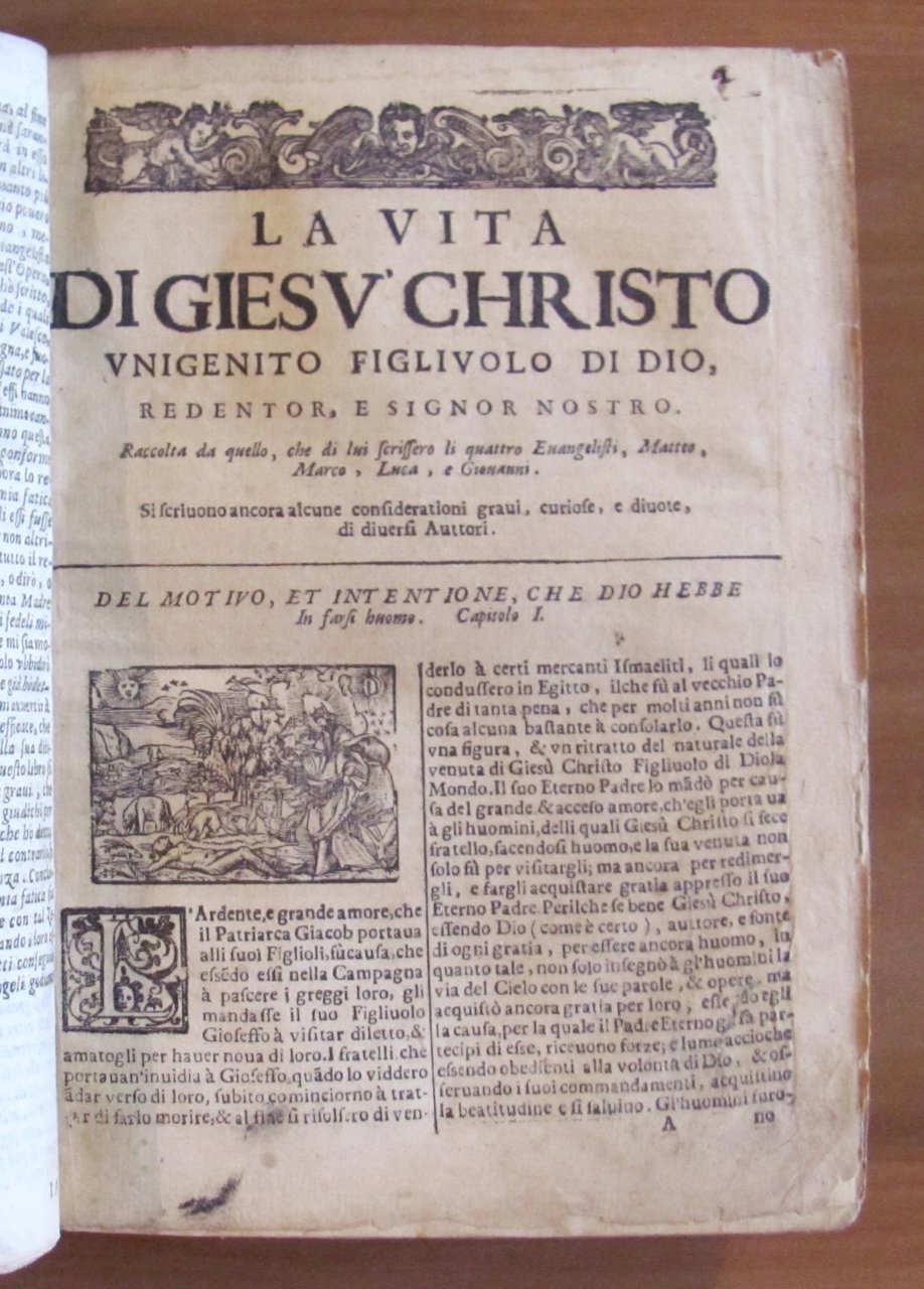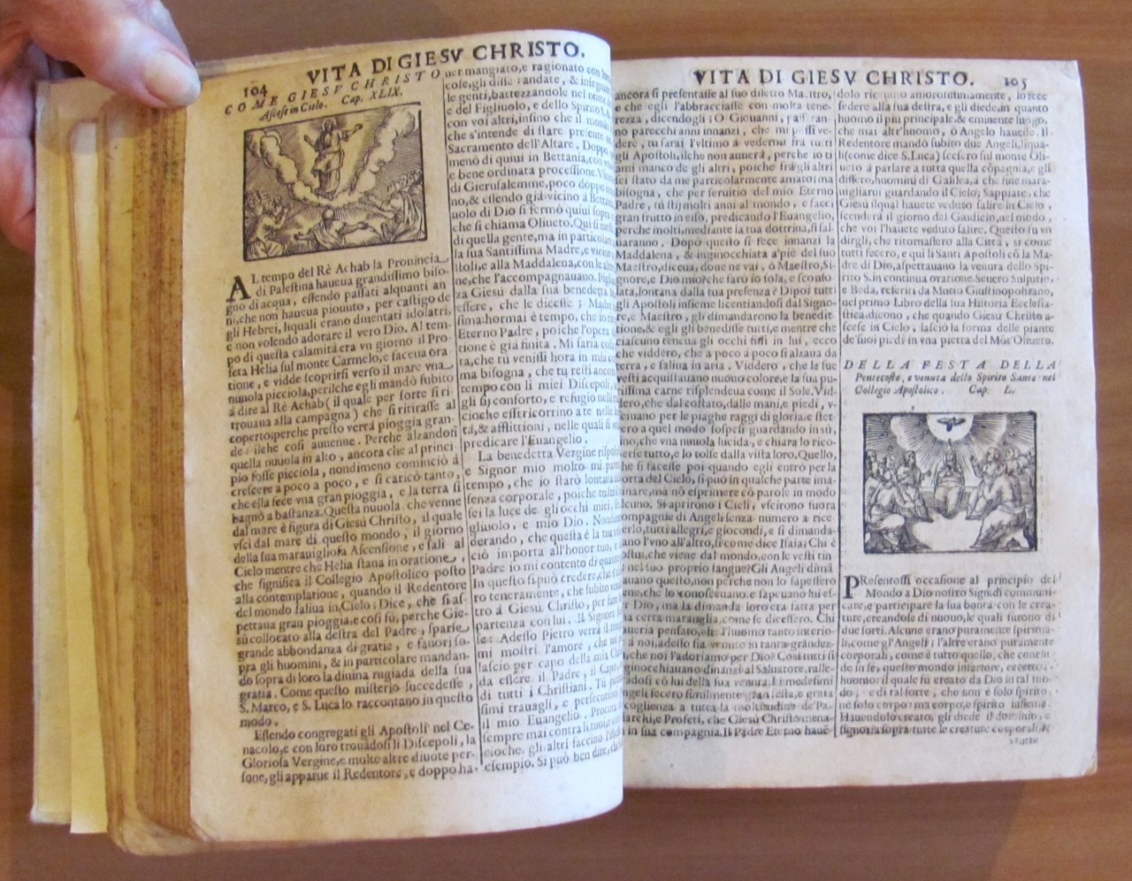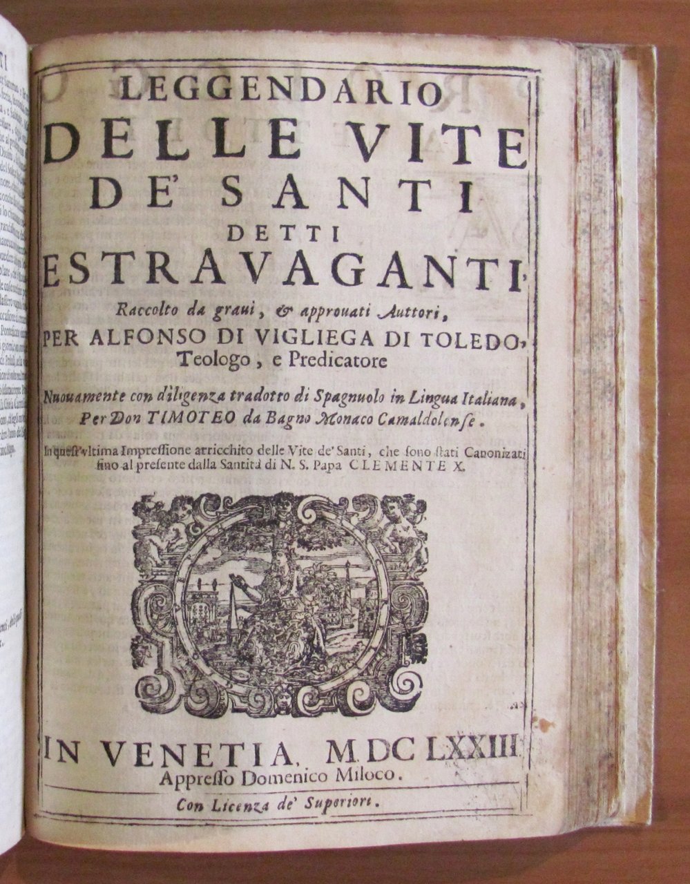Unito a: Leggendario delle Vite de' Santi detti Estravaganti. Varie piccole incisioni n.t. Editore Domenico Miloco - Venetia, 1673. Rilegatura coeva in cartone rustico con tassello con titolo al dorso. Copertina in brossura originale conservata leggermente brunita. Alcune pagine hanno la numerazione sbagliata ma completo. 17x23; pp.800+228. Raro e in Ottimo stato. , Molto buono (Very Good)