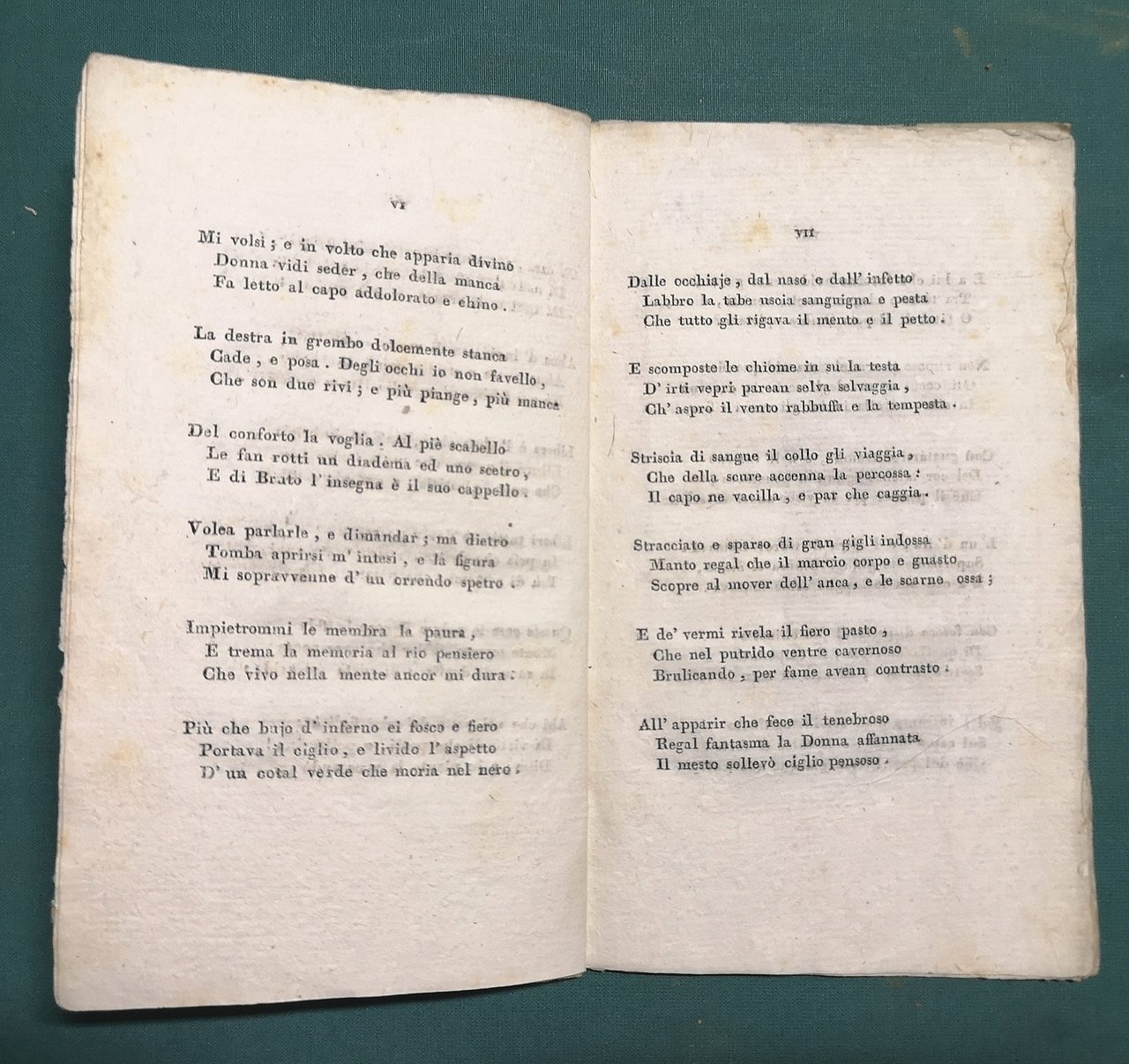 >in-16, pp. XVI, carta muta coeva. Probabile edizione originale di questo canto in terza rima, ultima delle cosiddette canzoni giacobine, scritta in occasione del fallito tentativo di restaurazione monarchica in Francia il 18 Fruttidoro (i.e. 4 settembre) 1797. Bustico, 340.