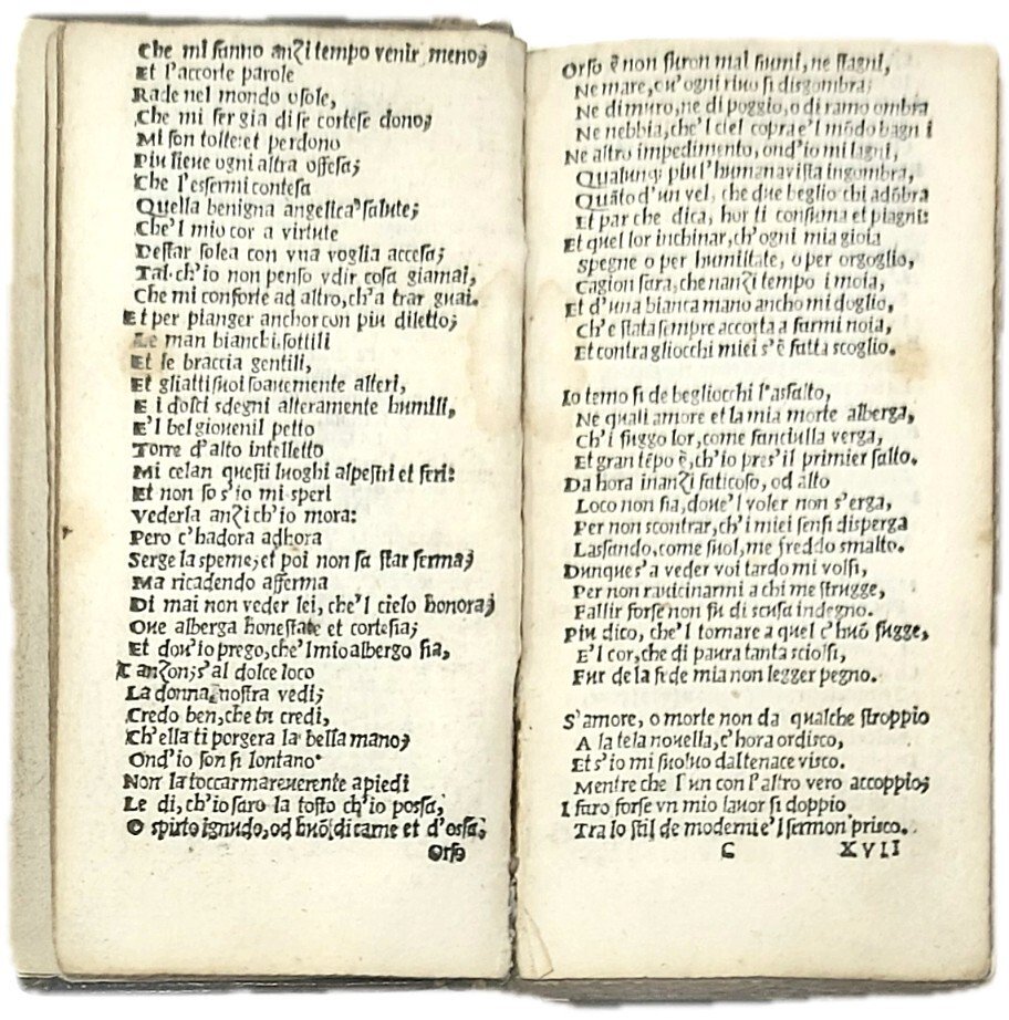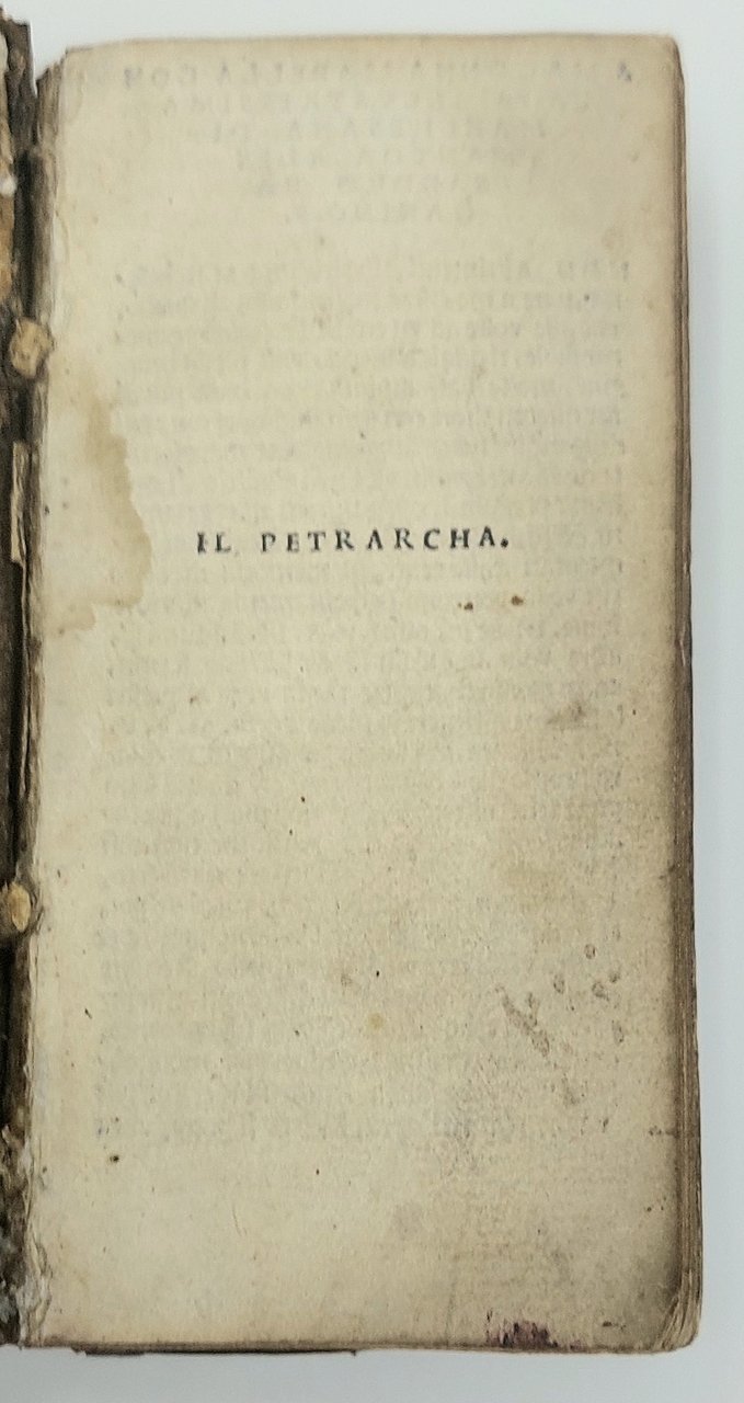 Volume veramente fuori dall'ordinario, probabilmente rilegato come dono a una gentildonna. Si conoscono esempi di legature “dos-à-dos” oppure denominate “tête-bêche”, che però presuppongono l'unione di due testi, ruotati di 180 gradi. Non abbiamo reperito rilegature paragonabili a questa, in cui anche le iniziali del proprietario, S e B in questo caso, siano leggibili in entrambe le direzioni. Hortis 42; Bologna 351. Fiske/Fowler, 91. Marsand, 349. Ley, f. 118. Angela Nuovo, La parte veneziana della collezione in 24esimo di A. Paganino p. 37-62 e 81-106 "In questa innovativa veste, stampò alcuni testi fondame