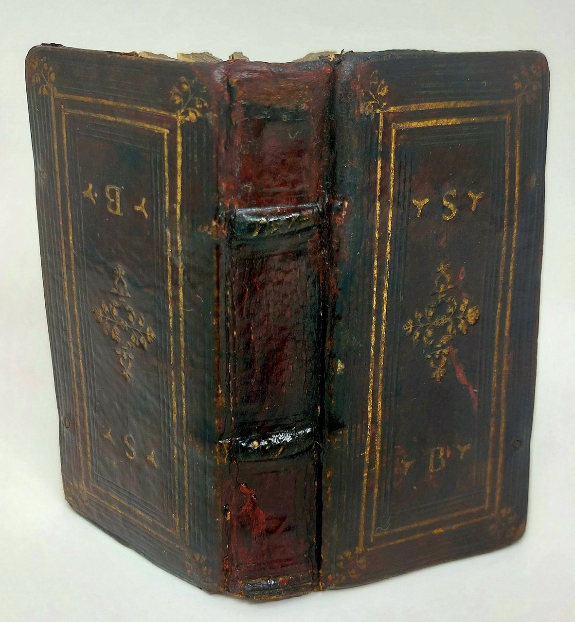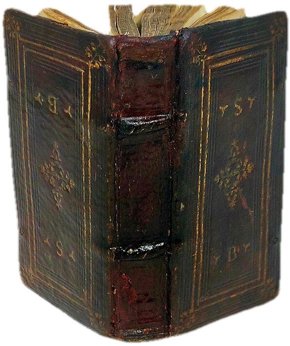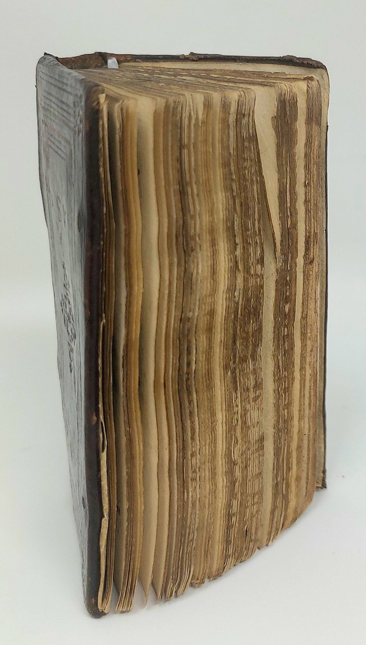 >in-24, (100x50 mm), ff. 162 (num I- CLXI, (1), iI, il colophon è al verso di T2). Rispetto ad altri esemplari collazionati sono presenti varianti con errori di paginazione ai ff. R5 (num. CXXXII, invece di CXXX) e V5 (num. CLVI invece di CLXI). Di notevole interesse è la legatura coeva in marocchino rosso scuro, con i piatti decorati upside-down: la doratura è identica ma ribaltata e le iniziali S e B sono leggibili in entrambe le direzioni. Il dorso muto è con due nervi e pochi filetti a secco. I piatti sono decorati da un grande fregio floreale al centro e 4 più piccoli agli angoli, da due riquadri di filetti in oro e da ben 10 riquadri a secco; in alto e in basso le due iniziali S e B, che sono impresse upsidedown sul piatto posteriore, tagli cesellati. Sulla sguardia anteriore note a matita del libraio Giuseppe Martini (asta 1934) e nota di possesso di Arturo Tildman, seguito dai versi "Dice mia Donna, e'l suo dir, è il mio cuore / Questa è lingua di cui si vanta Amore." tradotti dalla Canzone di Milton "language in which in which love delights". Il Reverendo Tildman (1792-1868) fu diplomatico a Palermo e Messina intorno al 1850.