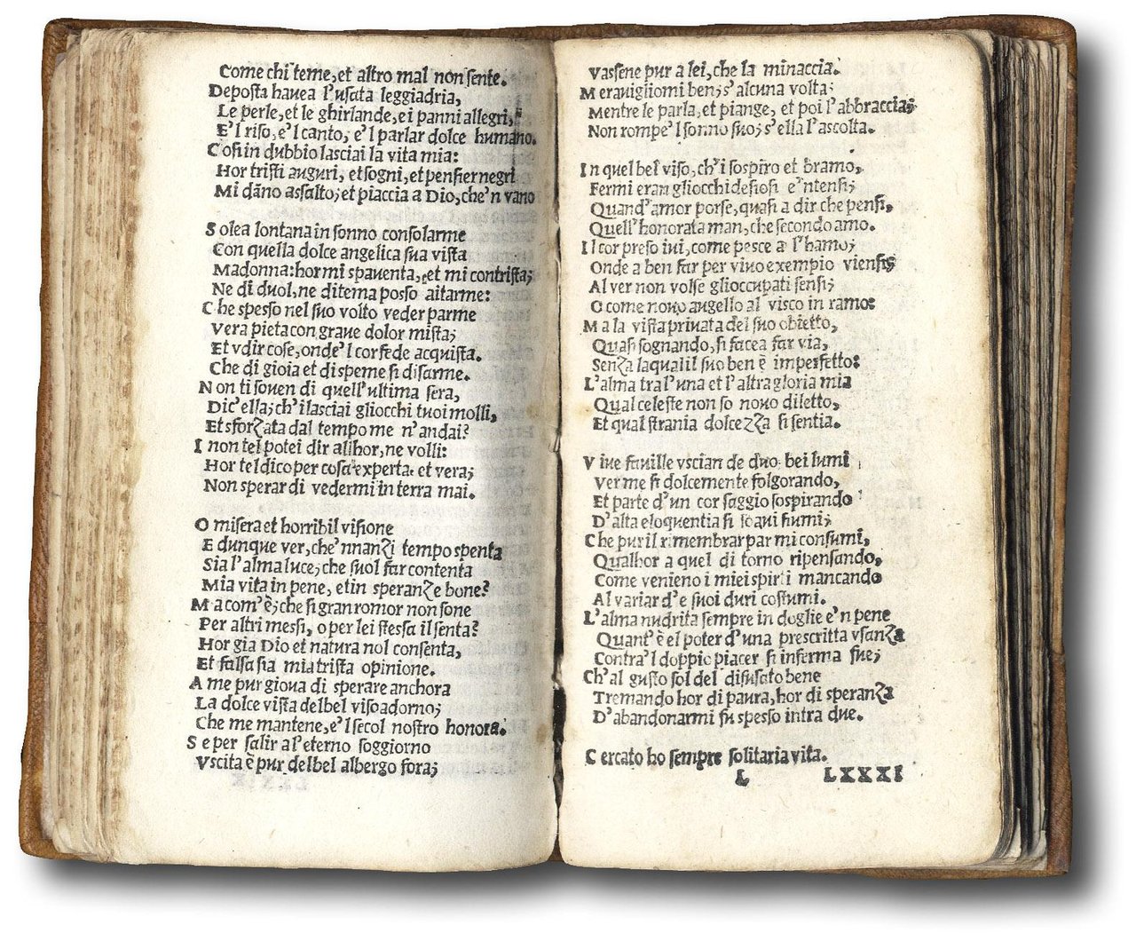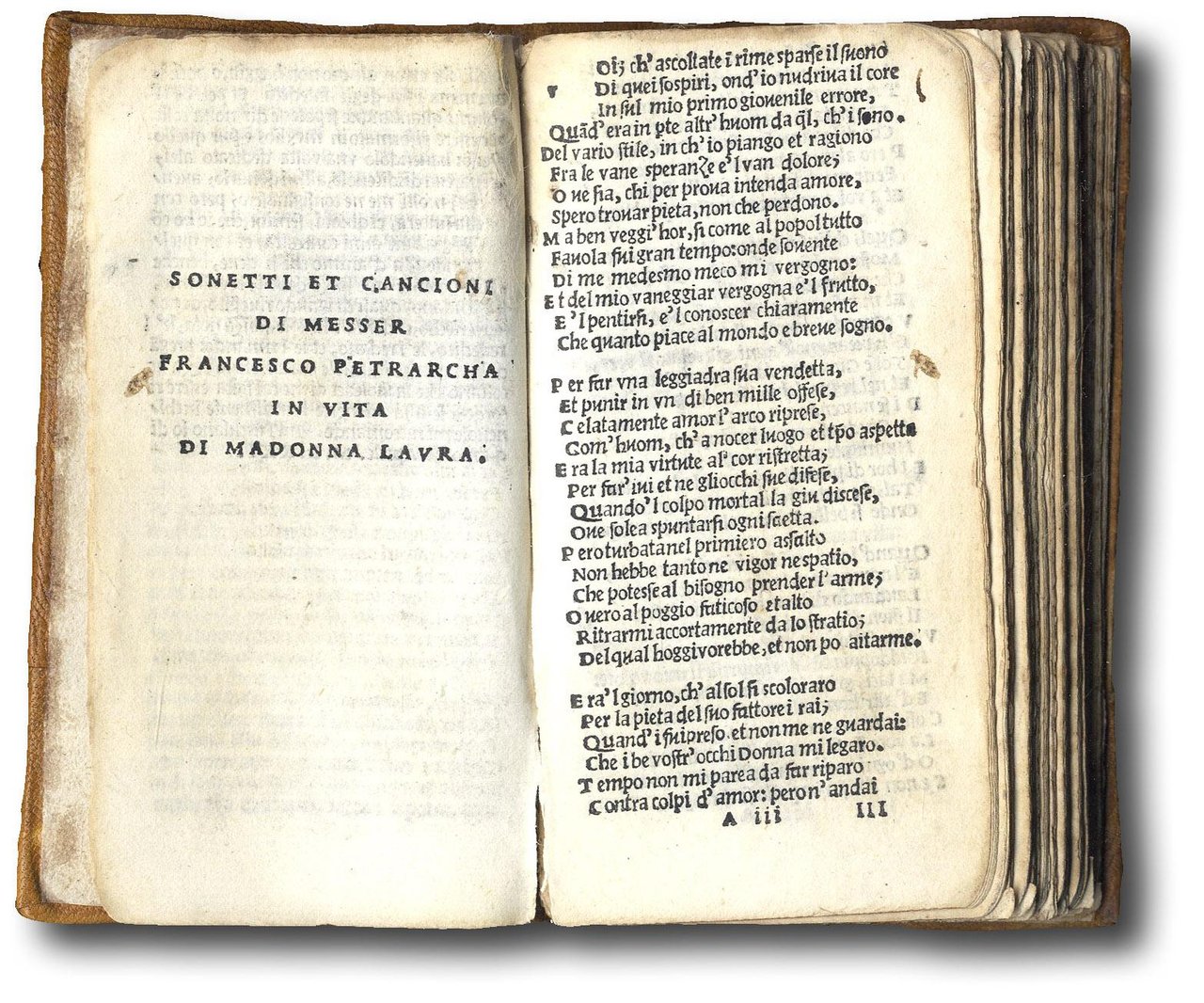 >in-24, (100x55 mm),  ff. 160 ??158 su 162 (num I- CLXI, mancando il f. k8 , V3, V4 e V6 ), legatura coeva in pergamena con nodi impressi ai piatti entro bordura, tagli cesellati (ampi restauri alle cuffie e agli angoli dei piatti e al dorso); elegante astuccio di dimensione maggiore nel cui spessore è incassato del volumetto, racchiuso in uno scomparto rivestito di velluto blu; dorso in pelle screziata blu. Elemento distintivo (e vincente) dei Paganini furono senz'altro le loro collane di pubblicazioni con caratteristiche editoriali unitarie: Petrarca era stato l'autore con cui nell'aprile del 1515 il Paganini aveva scelto di inaugurare a Venezia la propria collezione in “picciola formetta di novo e bellissimo carattere di letere, le quali alla penna assomigliano”.  Anche questa riedizione di Toscolano fu dedicata a Isabella d'Este: il Canzoniere era un classico amato dalle dame colte e alcune, come l'Eleonora di Toledo ritratta dal Bronzino, vollero farsi ritrarre con il leggiadro petrarchino fra le dita. Secondo Angela Nuovo “La collezione in ventiquattresimo è uno dei nodi dell'editoria di Alessandro: le è affidato un programma preciso e coerente… converrà tenere presente le invenzioni e gli spunti fecondissimi di Aldo e da questi ricostruire un disegno che, con mira più modesta, tempestivamente rispondeva alle nuove esigenze dei lettori, e quindi anche all'innegabile ridimensionamento della grande scuola umanistica italiana" (A.Nuovo). Dopo alcuni esperimenti di stampa a Salò, nel 1517 si trasferì a Toscolano e sulle rive del Garda pubblicò ancora una decina di edizioncine e, proprio nella nuova dedica a Isabella d'Este del Petrarca del 1521, scrisse che licenziava la nuova edizione perché «con ogni ingegno mio, ogni sapere operando, credo haver migliorato di sorte che senza ammenda e con più vaghezza dell'opera leggere si potrà». Luigi Balsamo aveva esaltato l'elevato sperimentalismo di Alessandro e questo minuscolo carattere da molti definito 'bizzarro'. Paganino ebbe un'enorme richiesta per il Petrarchino e ne fece un'alta tiratura, ma i volumi di picciola formetta furono letteralmente consumati dai lettori. La rarità delle copie rimaste fa sì che sia censita in sole 5 biblioteche italiane e sia mancante alla BNF. Esemplare completo del colophon al verso di T2, prima dell'indice e di versi di vari autori tra cui Cino, Cavalcanti e Dante, ma mancante del foglio K8 e di metà dell'ultimo quaderno (firma abrasa al titolo). Hortis 42; Bologna 351. Fiske/Fowler, 91. Marsand, 349. Ley, f. 118. Angela Nuovo, La parte veneziana della collezione in 24esimo di A. Paganino p. 37-62 e 81-106 "In questa innovativa veste, stampò alcuni testi fondamentali della letteratura volgare coeva: Petrarca, gli Asolani di Bembo, l'Arcadia di Sannazaro. È evidente l'ispirazione manuziana dell'operazione, principiata nello stesso anno della morte di Aldo (1515) e imitata nel costume umanistico dell'aggiunta di dediche e testi introduttivi al lettore" . Catalogo "Senza ammenda e con più vaghezza", Mostra 2008: "Dopo le edizioni di autori latini, il Paganini inserì nella collezione benacense il Petrarca volgare". Speck n.202 "Erste kleinformatige Ausgabe der Rime".