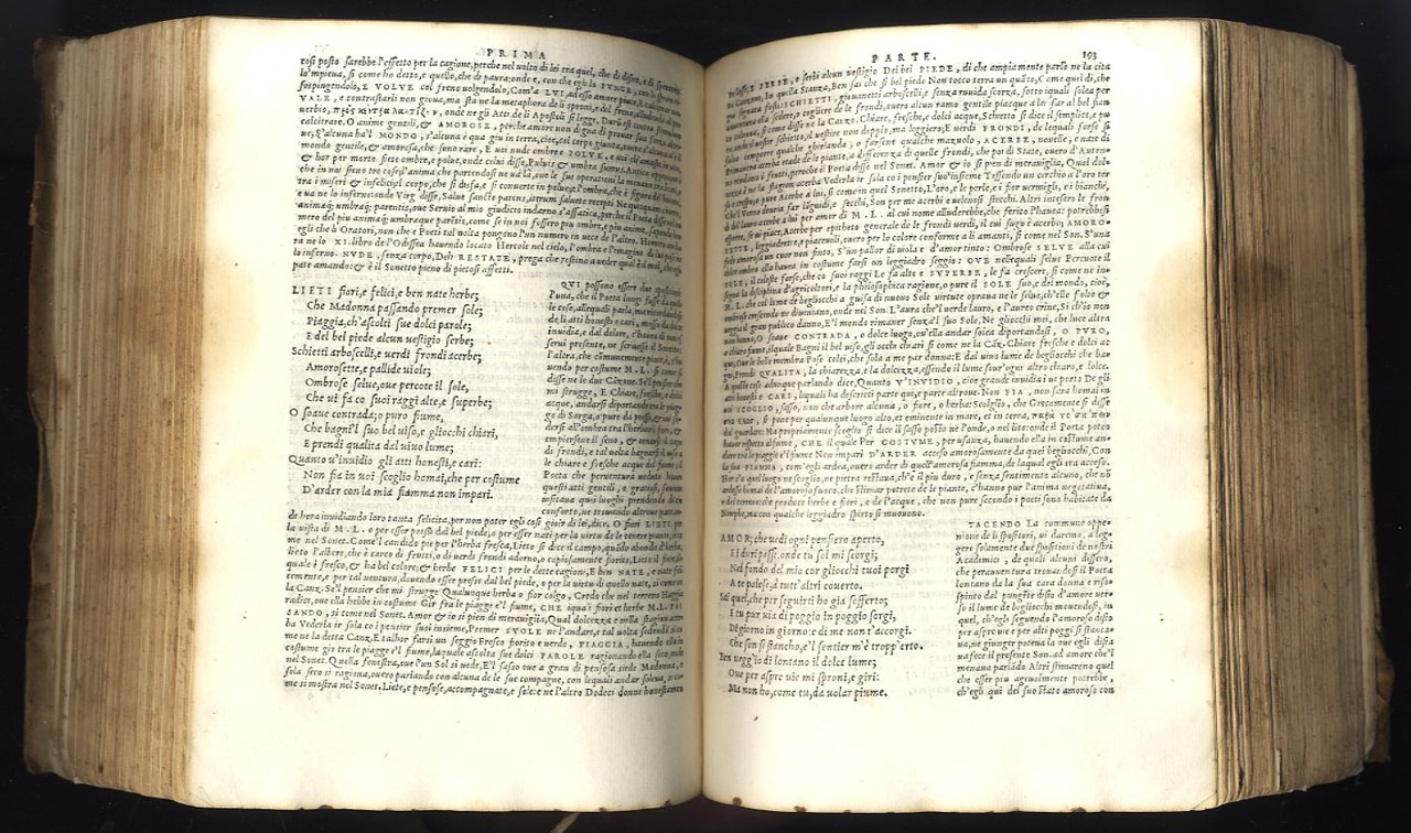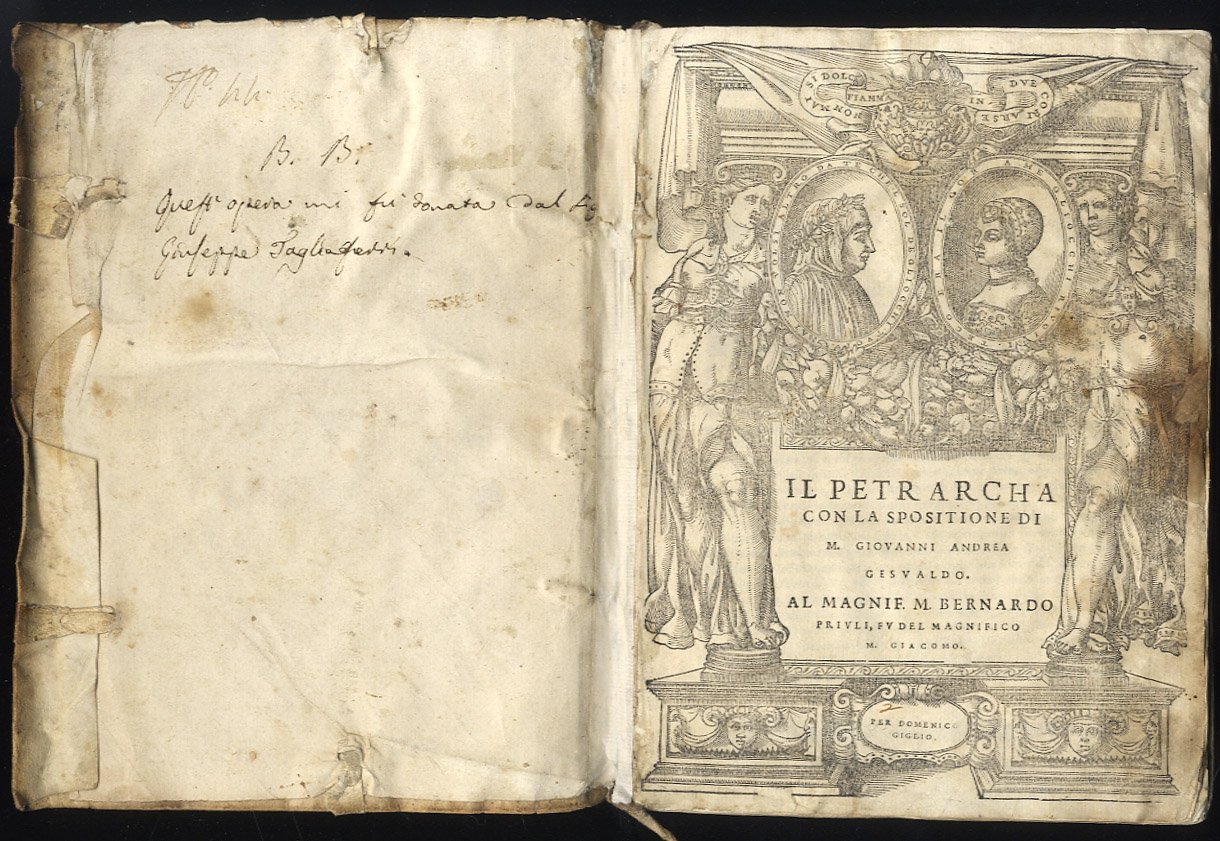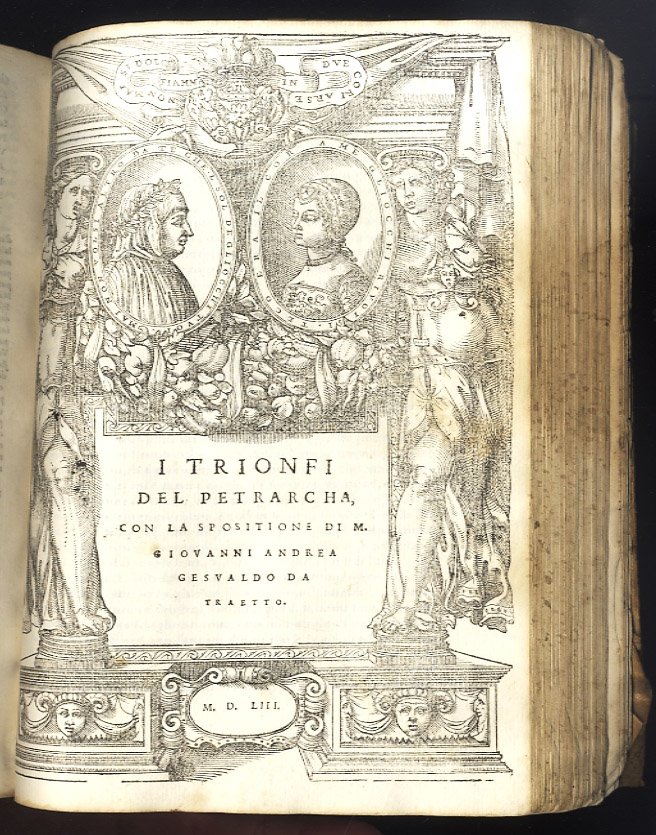>2 parti in 1 vol. in-4, ff. (22), 346; (72), legatura coeva in pergamena (un po' usurata ma genuina), titolo ms. al taglio inferiore. Due bei frontespizi con ritratti di Petrarca e Laura entro bordura di figure allegoriche; in fine impresa editoriale, numerose ill. silogr. n.t. Terza edizione (la prima Venezia, Nicolini, 1533) del Canzoniere commentato dal Gesualdo; comprende nella prima parte Sonetti, Canzoni e le Canzoni in morte di Madonna Laura; nella seconda, con proprio frontespizio, i Trionfi. Testo in carattere corsivo racchiuso dal commento, in finissimo car. sempre corsivo. Le opere sono precedute oltre che da varie dediche, esplicazioni e indici, dalle Vite di Petrarca e di Laura. Ognuno dei sei Trionfi (d'Amor, de la Castità, de la Morte, de la Fama, del Tempo, de la Divinità overo de l'Eternità) presenta una bella vignetta silogr. inerente al testo. Magnifica edizione, per la qualità dei caratteri, dei legni, dell'impaginazione e della carta; assai stimato il commento del Gesualdo: "Introdotto da una biografia del Petrarca con sezioni interne autonome, il commento prende il testo come occasione per affrontare questioni di diversa natura in forma di divagazione erudita..." (DBIt 53, pp. 505-506.) Complessivamente buon esemplare (tracce di polvere al primo titolo, bruciature al margine esterno dei primi 3 ff., piccolo restauro al frontespizio che sfiora la parte figurata; antica nota di possesso manoscritta cancellata al foglio della dedicatoria). Gamba 722, note. Adams P-820. STC 505.