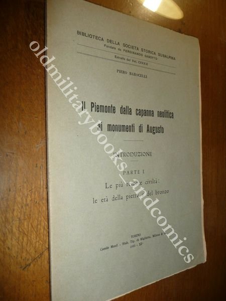 TITOLO: IL PIEMONTE DALLA CAPANNA NEOLITICA AI MONUMENTI DI AUGUSTO Parte I Le più remote civiltà: le età della pietra e del bronzo. DESCRIZIONE: Stab. Tip. di Miglietta Milano 1933 Estratto dal vol. CXXXIX br. ed. pp. 48 in 8°. CONDIZIONI: Buone. PESO / WEIGHT: 100 gr. without package