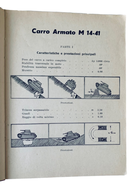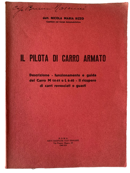 In 4°; 95, (1) pp. Brossura editoriale rossa con titolo impresso in nero al piatto anteriore. Nota di proprietà privata manoscritta a matita, al margine alto, del piatto anteriore. Perfette condizioni di conservazione. Prima rara edizione di questo importante manuale tattico-tecnica per il pilota di carro armato opera del Capitano nel Corpo Automobilistico dell'Esercito Italiano, Maria Nicola Rizzo. L'opera apparteneva al Dott. Cav. Mascucci capitano dal 1936, del Reggimento Corazzato Lancieri "Vittorio Emanuele II" nel distretto di Siena. I capitoli dell'opera sono: Carro Armato M 14-41; Caratteristiche e prestazioni principali: Scafo, Motore, Pompa d'iniezione Fiat, Organi della trasmissione, Organi della direzione e della frenatura, Organi di propulsione esterna e sospensione, Equipaggiamento elettrico, Manutenzione dell'equipaggiamento elettrico, Visibilità all'interno del carro, Avviamento del motore; Norme da osservarsi nella condotta del carro M 14-41: Uso del cambio di velocità, Uso delle leve di direzione; Norme di manutenzione: Verifica delle prestazioni dei freni, Sospensione, Cingoli; Carro Armato L 6-40: Motore, Organi di trasmissione, Impianto ed apparecchiatura elettrica, Norme d'uso e manutenzione; Il recupero di carri rovesciati e guasti. Prima rara edizione in perfette condizioni di conservazione.