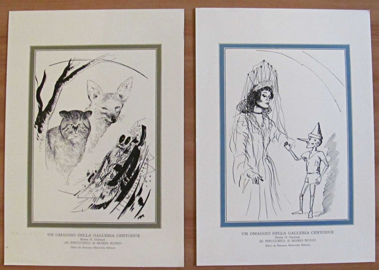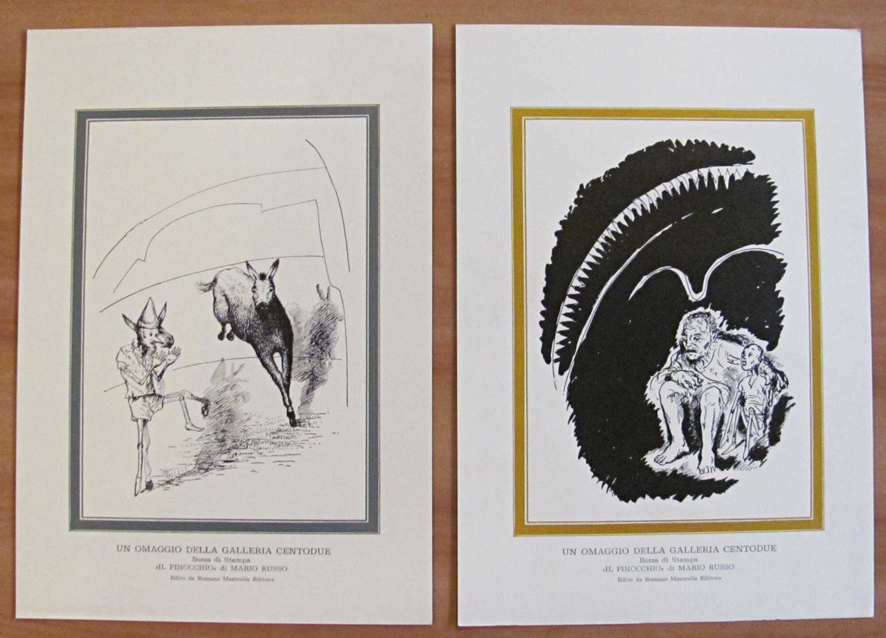 Il Pinocchio di Mario Russo. Con un saggio di Michele Rak. 1881 - 1981 Cento anni con Pinocchio. 7 tavole in b/n f.t. di Mario Russo e Suite con le stesse 7 tavole sciolte impresse su torchio a mano. Dedica Autografa dell'Autore Editore Romano Mastrella - Roma, 1981. Tiratura limitata a 500 esemplari, Ns. N. 79. Tela editoriale con suite di 7 tavole. 24x33; pp.28. Stato di Nuovo. , Perfetto (Mint)