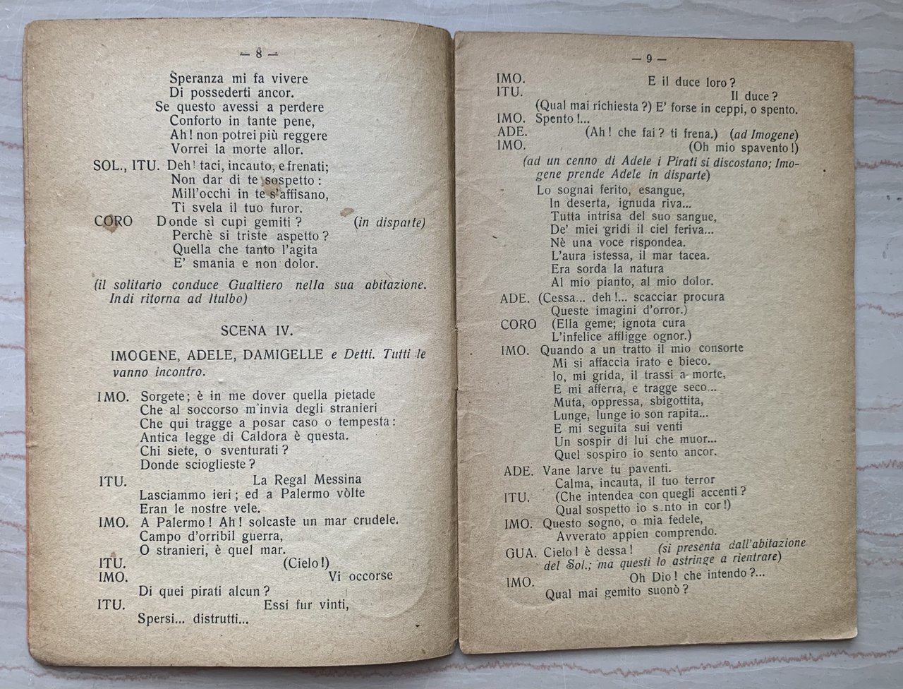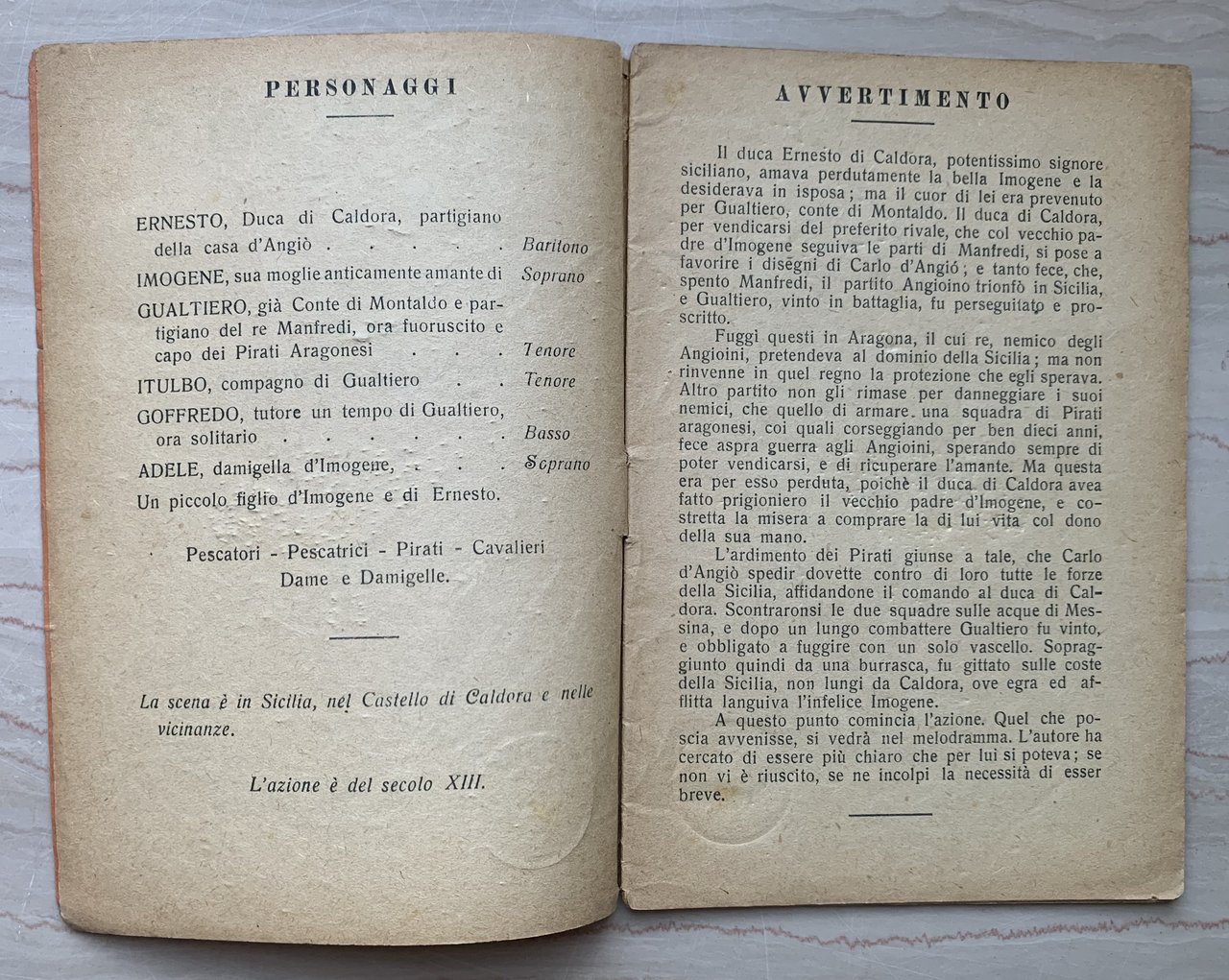 ed. 1931 - IX (1a rappresentazione: Milano, Teatro alla Scala, 27 ottobre 1827). XVI/32/brossura in carta leggera albicocca con titoli e ornato in nero al primo piatto. Stato d'uso (usura della copertima ai margini e, in particolare, al dorso e all'angolo inferiore sinistro dell'ultimo piatto che presenta una piccola mancanza - strappo al margine destro del primo piatto della copertina di ca. 2,5 cm che arriva fino all'ultima lettera del titolo - numero da catalogazione ad inchiostro nero all'angolo superiore destro del primo piatto della copertina che trapassa anche al secondo piatto - timbro a secco dell'Editore all'angolo inferiore sinistro della copertina che prosegue, scemando, nelle pagine successive - puntini a pressione al primo piatto della copertina e poi, via via meno profondi fino a p. 9 ca. - copertina e pagine brunite e con qualche piccola gora).