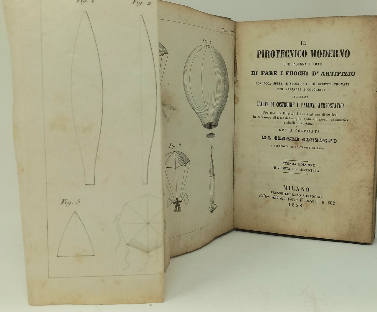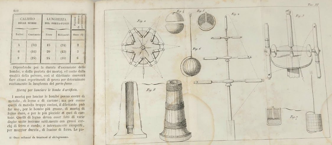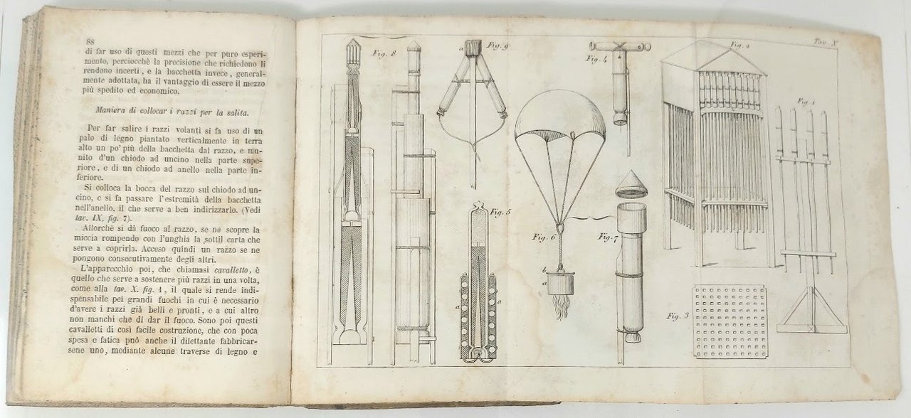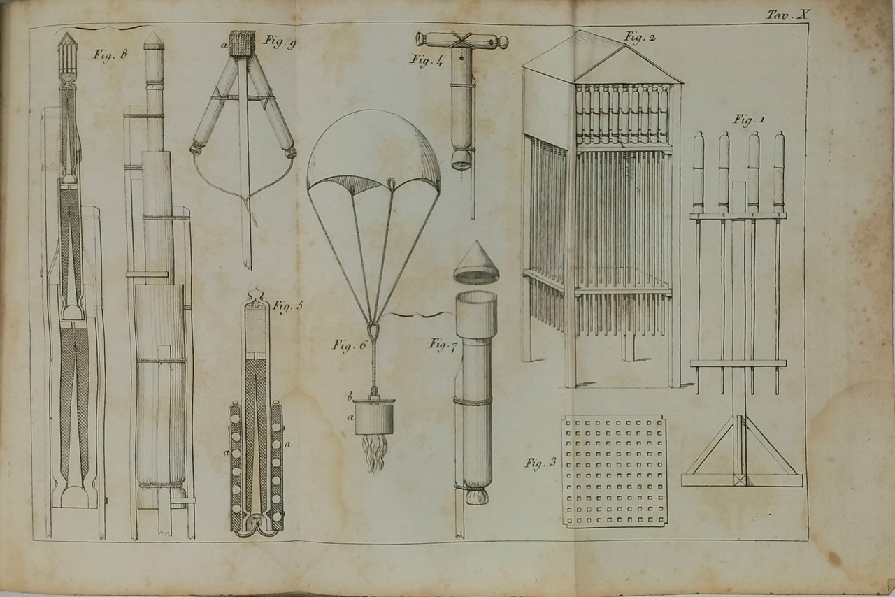 >in-8 piccolo (170x110 mm), pp. 147 e 13 tavole f.t, numerate I-XIII, alcune ripiegate ed altre a piena pagina, la tavola XIII precede il titolo e segue l'occhietto. Legatura coeva piena pergamena, tagli marmorizzati. Interessante manuale la cui prima edizione uscì nel 1846. I capitoli trattano dell'arte di fare i fuochi d'artifizio: Della costruzione dei cartocci; Della miccia comune, del lucignolo o miccia comunicazione, e delle lancie di servizio; Fuochi di guarnizione; Dei fuochi di terra; Fuochi diversi; Dei fuochi d'aria: Dei fuochi di decorazione; Fuochi ad uso dei teatri e fuochi così detti da mensa; Fuochi d'acqua; Disposizione generale di un fuoco d'artifizio, dell'arte di costruire i palloni aerostatici, dei palloni a paracadute, a fiamme colorate, a fuochi artificiali. Esemplare completo ma non privo di difetti, qualche macchia d'umido ed arrossatura. Strappo restaurato alla tavola XIII.