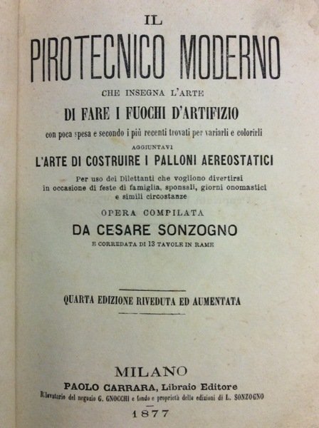 IL PIROTECNICO MODERNO CHE INSEGNA L'ARTE DI FARE I FUOCHI D'ARTIFIZIO. - Con poca spesa e secondo i più recenti trovati per variarli e colorirli. Aggiuntavi "L'arte di costruire i palloni aerostatici..."