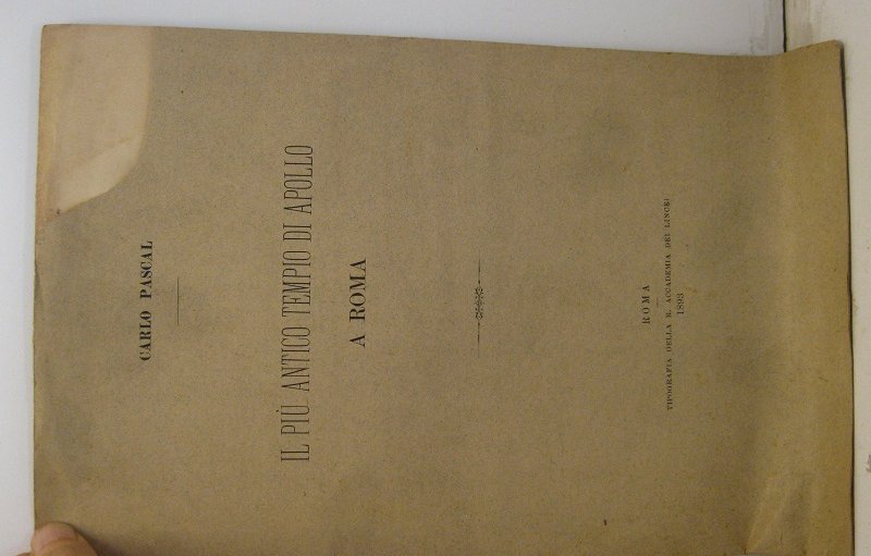 In 8, pp. 17 + (1b). Intonso. Lieve mancanza all'ang. est. sup. del p. ant. e del fr. Br. ed. Saggio relativo ad un antico tempio di Apollo, il piu' antico - secondo l'A. - attestato da un'epigrafe ritrovata all'Arenula, non lontano dal Tevere.