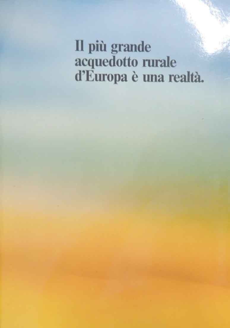 Il più grande acquedotto rurale d’Europa è una realtà, a cura del Consorzio di Bonifica Apulo Lucano, s.n. (ma stampato a Bari, presso la Stampa Editrice Safra srl) 1984, paginazione varia (per un totale di 9 c. non numerate, ill. col., 1 c. di tav. f.t. ripiegata ill. col., cm 30, pubblicazione spillata. Pubblicazione edita in occasione della cerimonia di inaugurazione dell’Acquedotto Rurale della Murgia. Disegni e impaginazione: Italsegno (Bari). Perfetto. Raro.