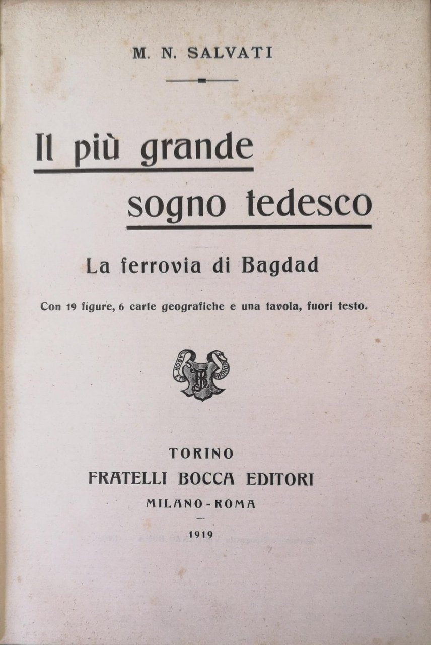 In-16 gr., cartonato coevo, titolo su tassello al dorso, pp. XXIII,260,(2), con 19 illustrazioni fotografiche in bianco e nero in tavole fuori testo, un ritratto dell'A. all'antiporta e 6 carte geografiche, di cui 2 più volte ripieg. fuori testo In Appendice: Documenti ufficiali riguardanti la Bagdadbahn - Testo della Convenzione Anglo-Russa sulle sfere di influenza in Persia del 31 Agosto 1907 - Dimostrazione dei tempi e dei vantaggi di rapidità della BB - Lettera di Sir Clinton Dawkins a Arthur von Gwinner. Qualche lieviss. fioritura intercalata nel testo, altrimenti esemplare ben conservato.